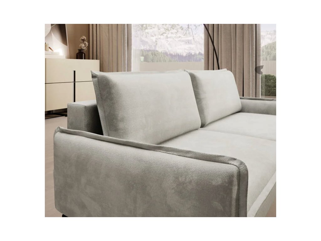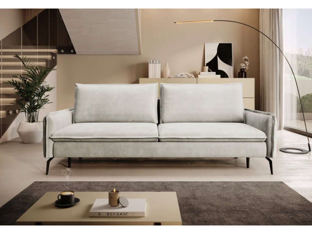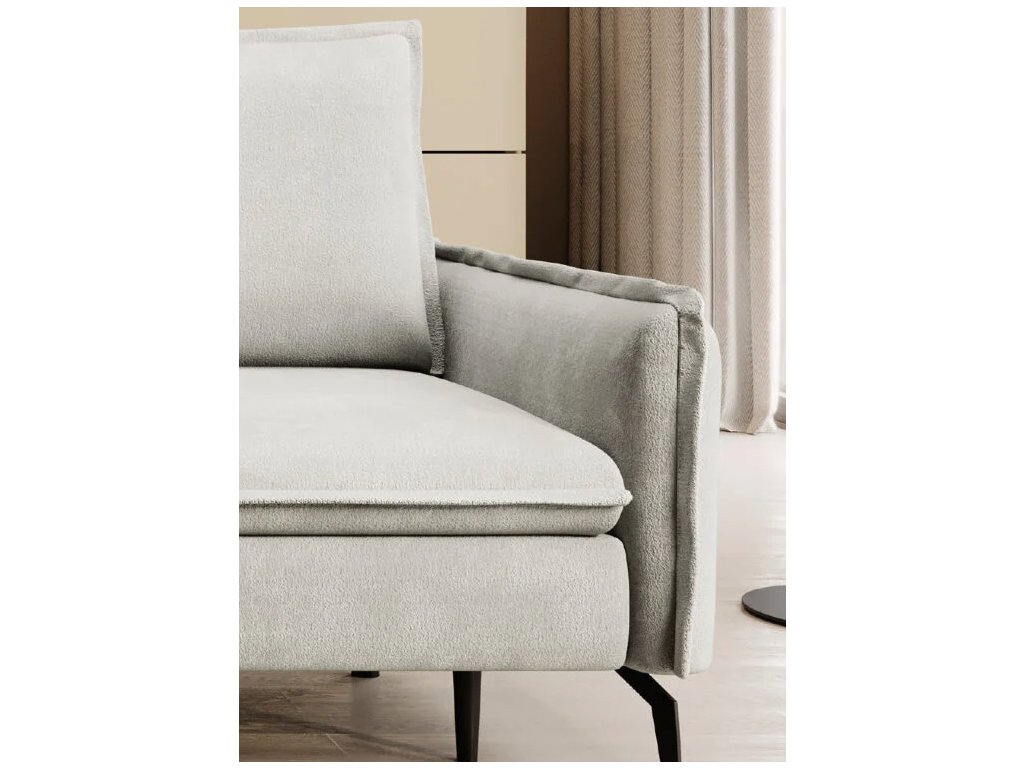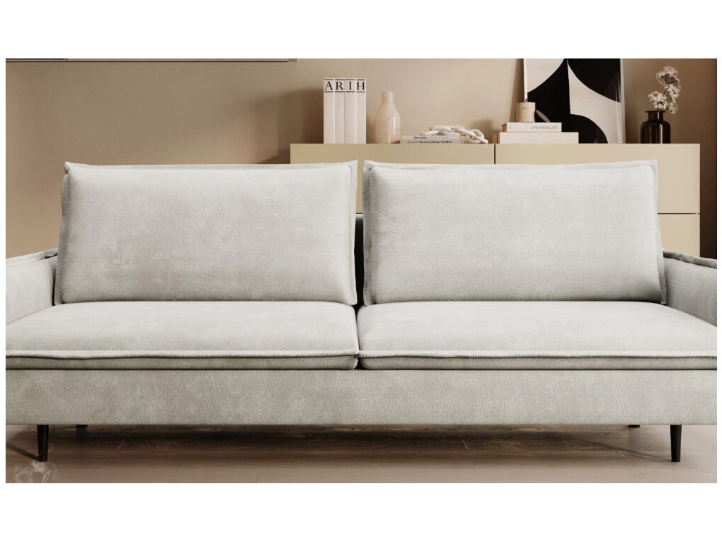 Součástí jsou dva volně ložené opěrné polštáře, které jsou, stejně jako horní část sedáku, zdobeny ozdobným lemem. Tento detail podtrhuje čisté linie pohovky a přidává na eleganci.