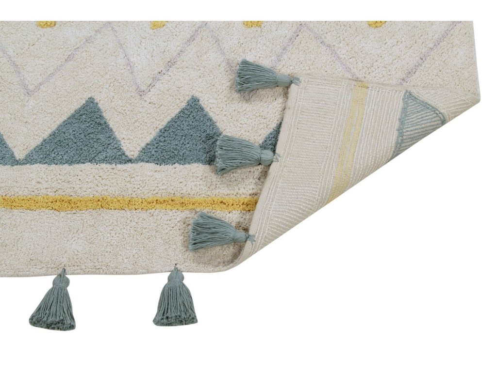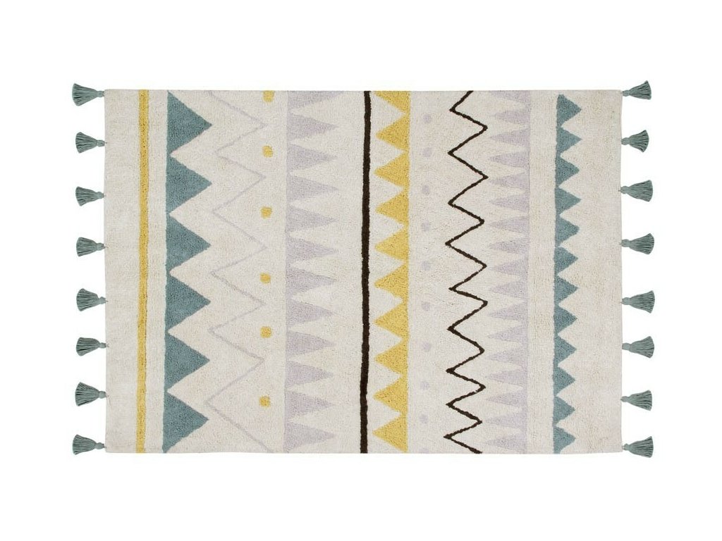 Bavlněný koberec v krémové barvě, od světoznámé značky Lorena Canals, s modrým a žlutým vzorem inspirovaném aztéckou kulturou. Měkoučký koberec s nádechem tajemna dávných civilizací snadno zakomponujete do každého interiéru. Díky možnosti praní v pračce jej můžete umístit i do venkovních prostor.