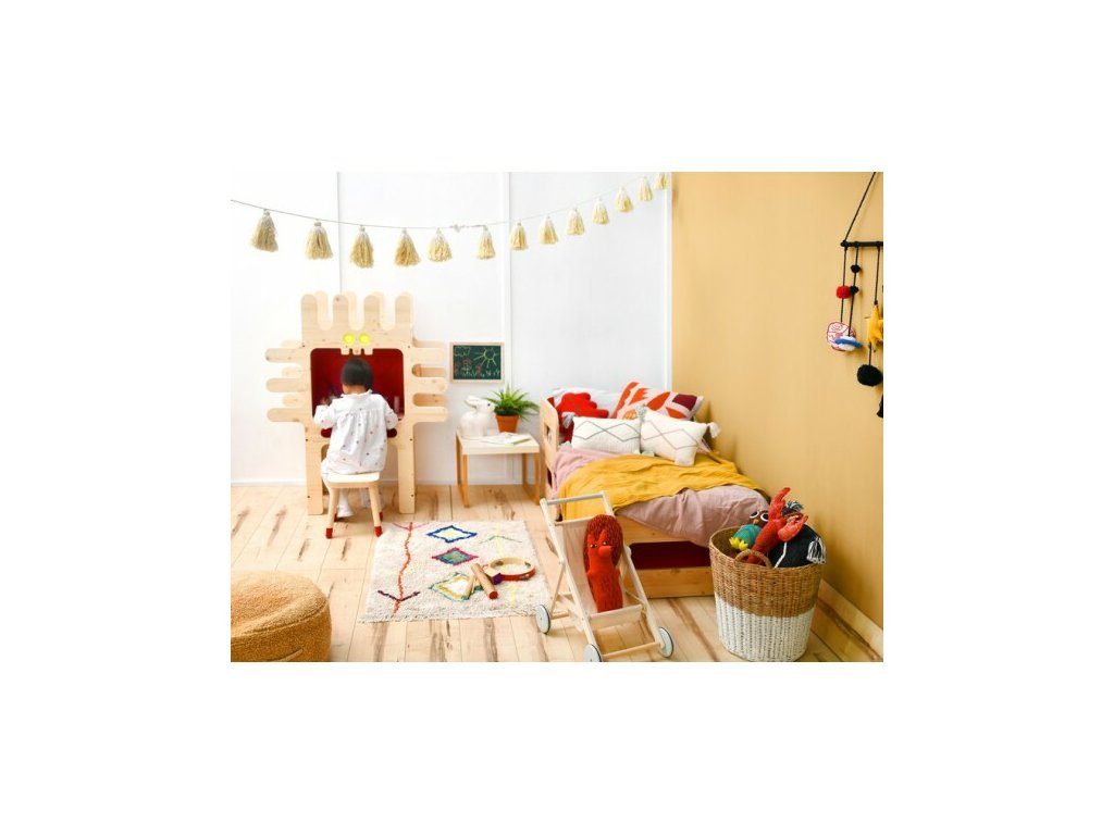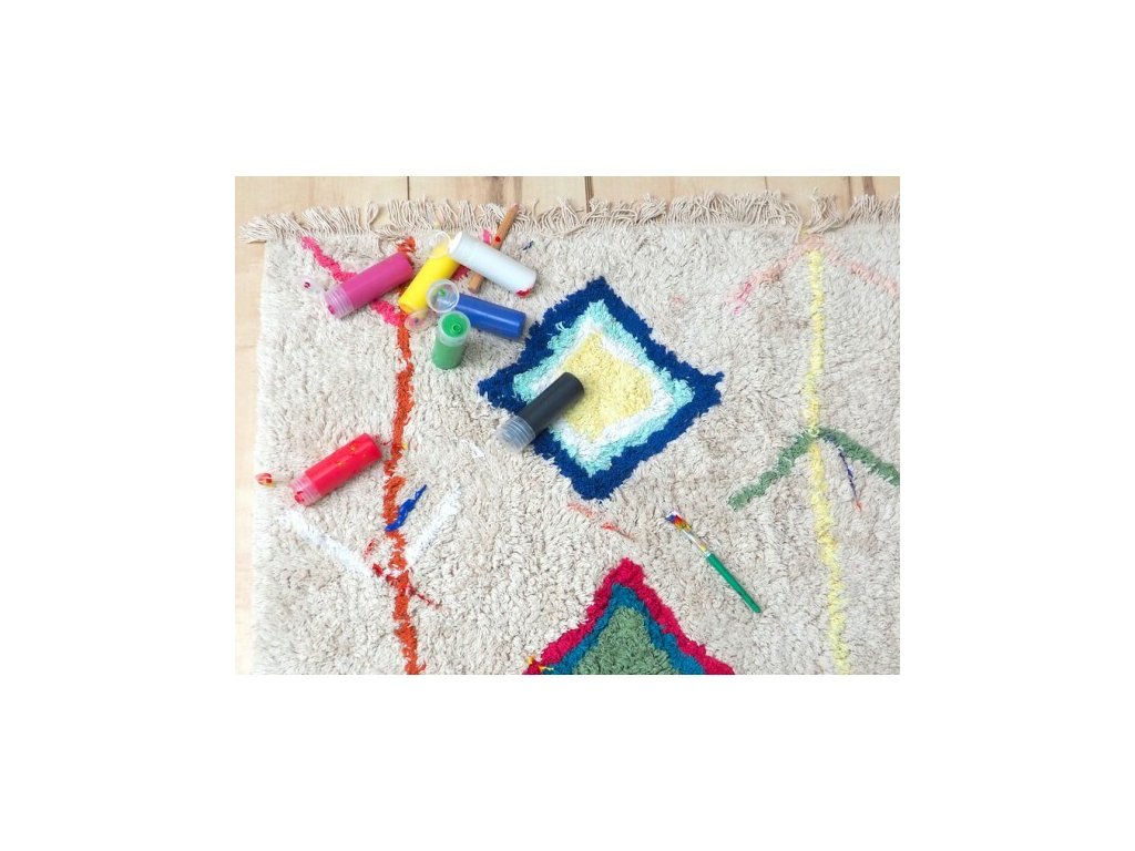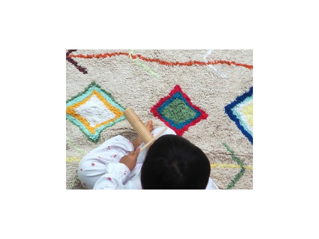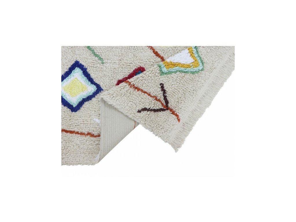 Bavlněný koberec v krémovém odstínu zakončený třásněmi s barevnými obrázky kosočtverců, od světoznámé značky Lorena Canals, s kosočtvercovým vzorem. si zamilujete pro jeho hravý vzhled inspirovaný marockým venkovem. Měkký a elegantní, vhodný do všech pokojů. Díky možnosti praní v pračce jej můžete umístit i do venkovních prostor.