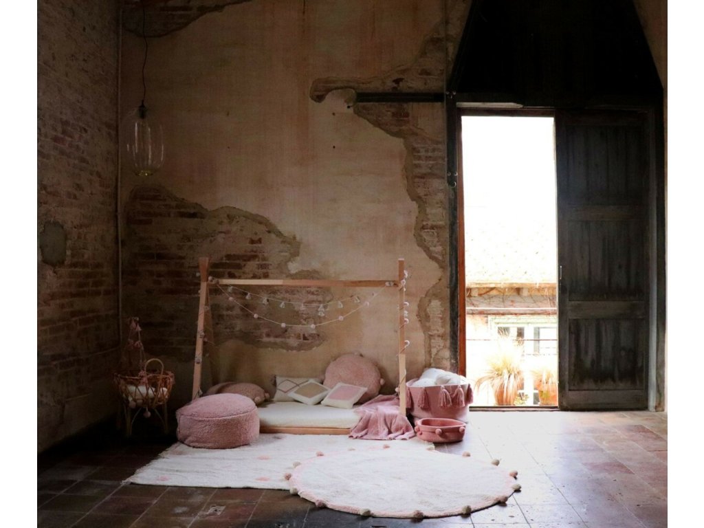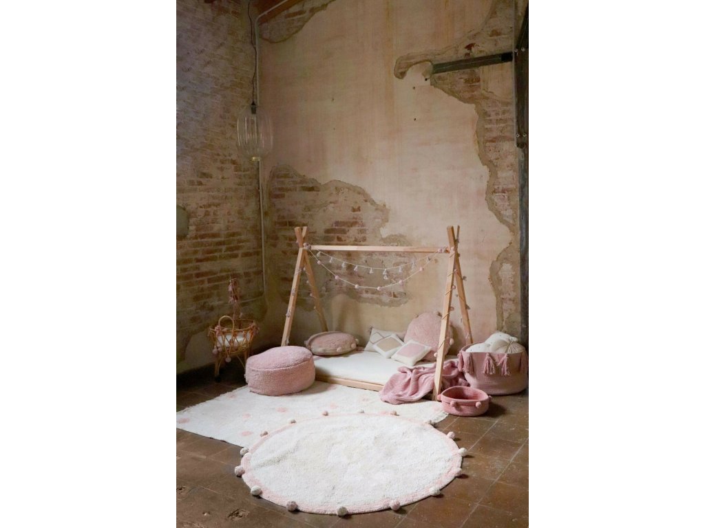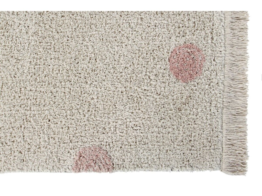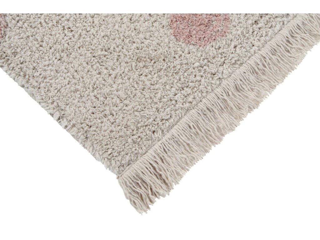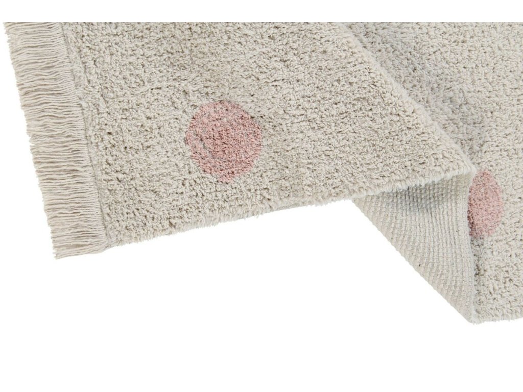 Bavlněný koberec v přírodní světlé barvě zakončený třásněmi, od světoznámé značky Lorena Canals, s puntíky v pudrové - světle růžové barvě. Měkký a elegantní, vhodný do všech pokojů. Díky možnosti praní v pračce jej můžete umístit i do venkovních prostor.
