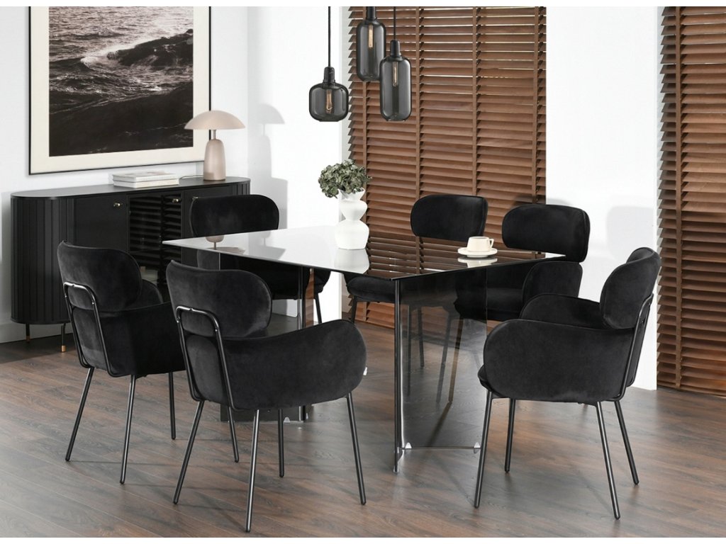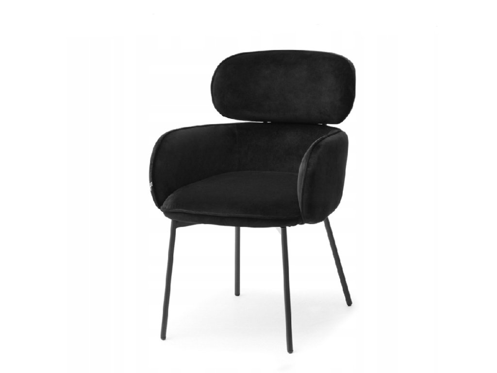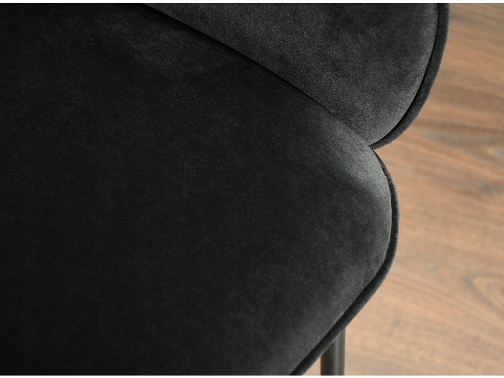 Jídelní židle Arlen kombinuje elegantní moderní vzhled s mimořádným komfortem. Černá sametová látka je příjemná na dotek a dodává židli noblesní vzhled, který zapadne do moderních, industriálních i minimalistických interiérů. Židle působí lehce, ale zároveň odolně díky pevné kovové podnoži.