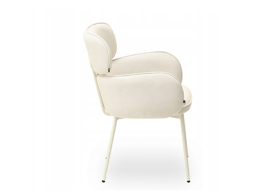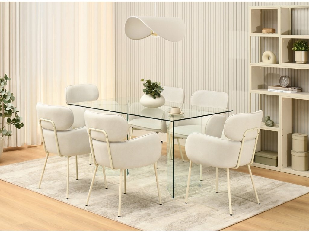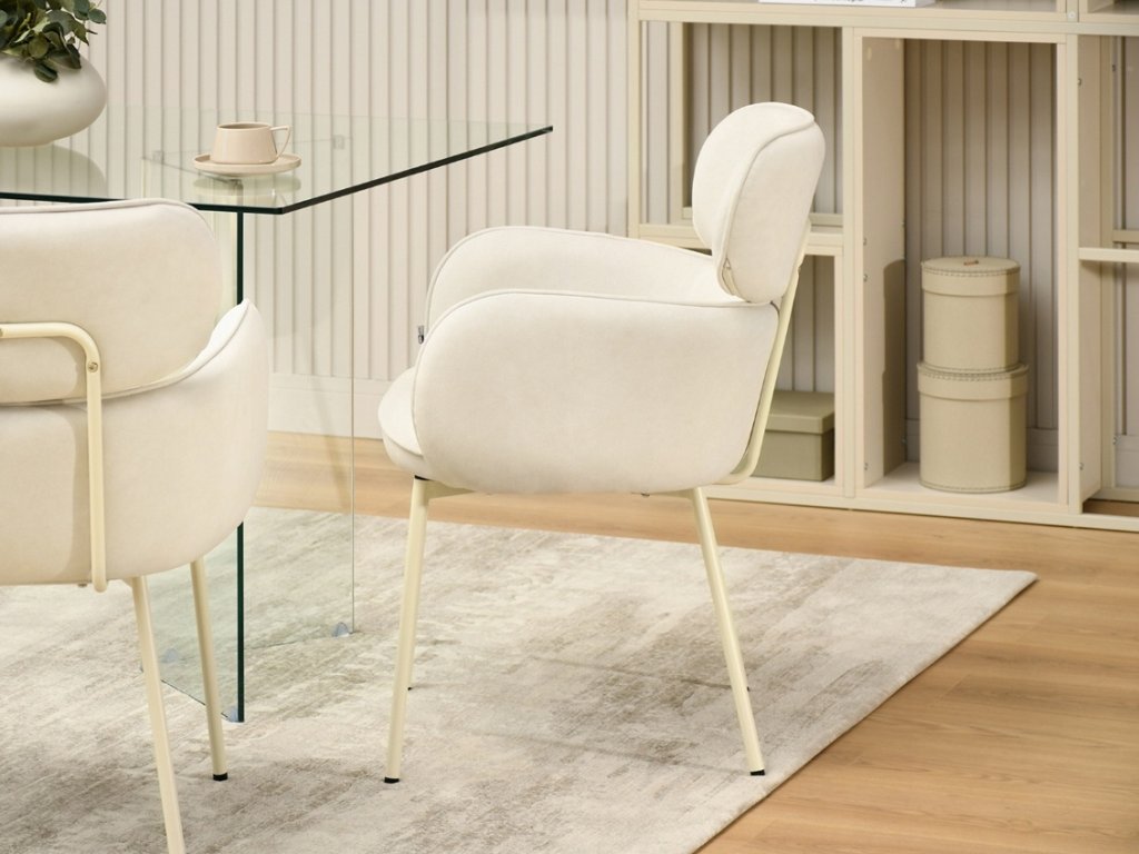 Jídelní židle Arlen kombinuje elegantní moderní vzhled s mimořádným komfortem. Krémový velur je příjemný na dotek a dodává židli jemný, nadčasový vzhled, který harmonicky zapadne do moderních, skandinávských i minimalistických interiérů. Židle působí lehce, ale zároveň je díky pevné světlé kovové podnoži velmi odolná.