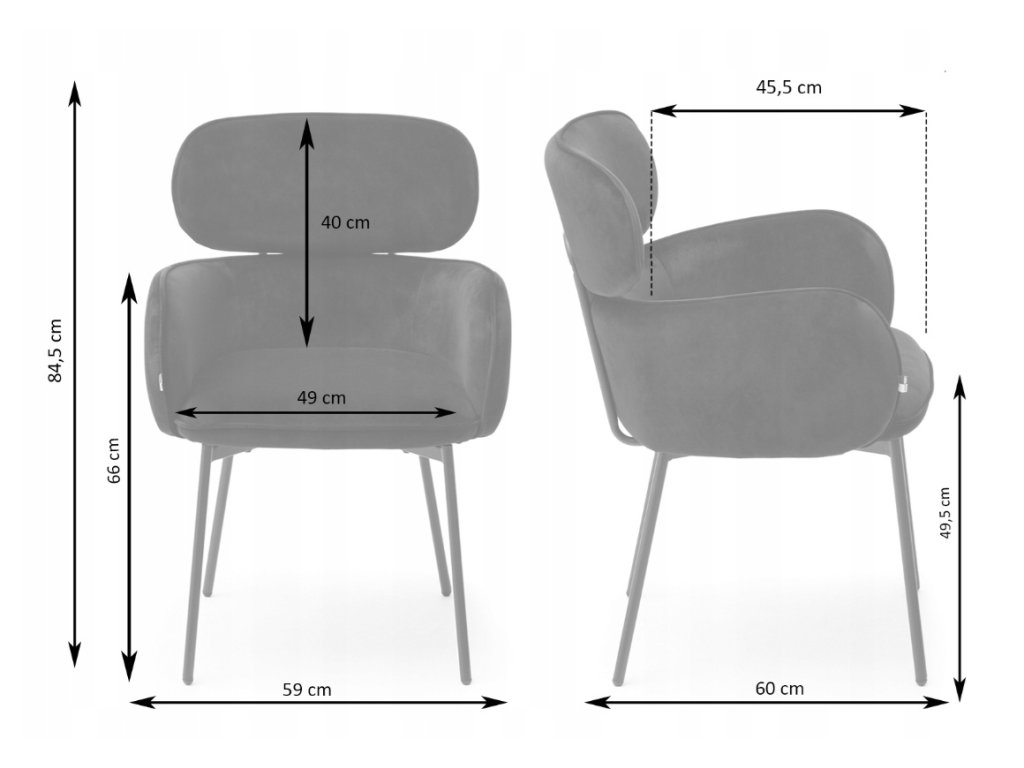 Sedák i opěrák jsou čalouněny měkkým velurem, který vytváří příjemné sezení i při delším stolování. Vyšší opěradlo o výšce 40 cm spolu s tvarovanými područkami obepínají tělo a poskytují jistou a pohodlnou oporu. Celková výška 84,5 cm zajistí komfortní sezení i pro vyšší osoby. Konstrukce je pevná a stabilní a při používání se nekýve.