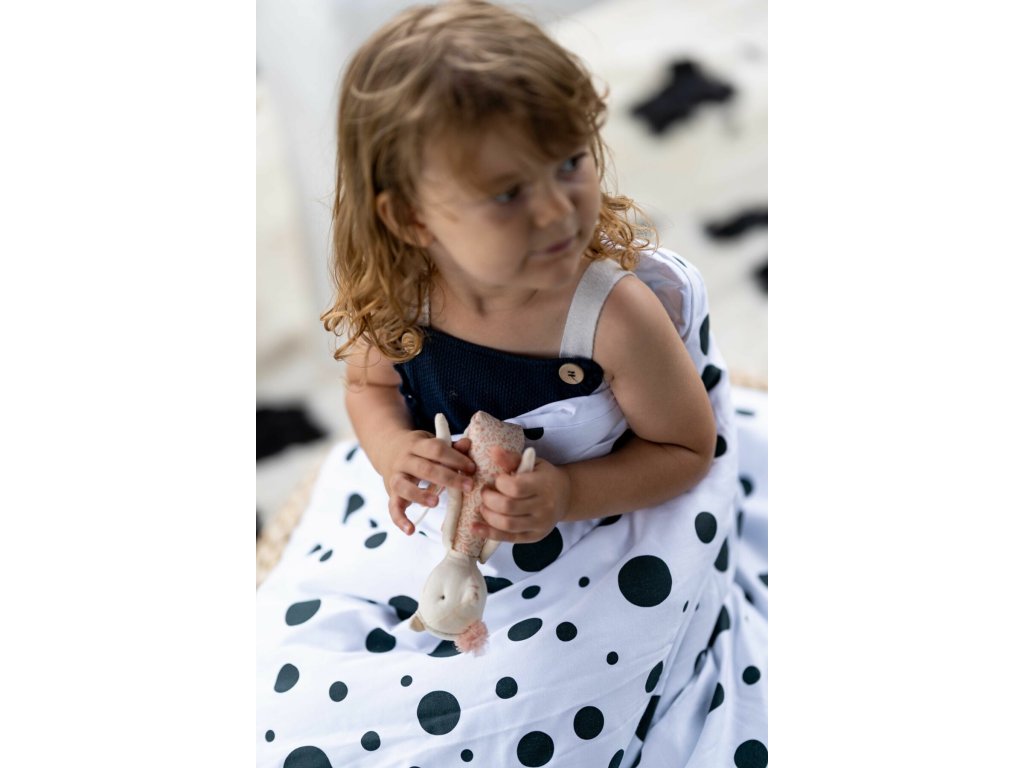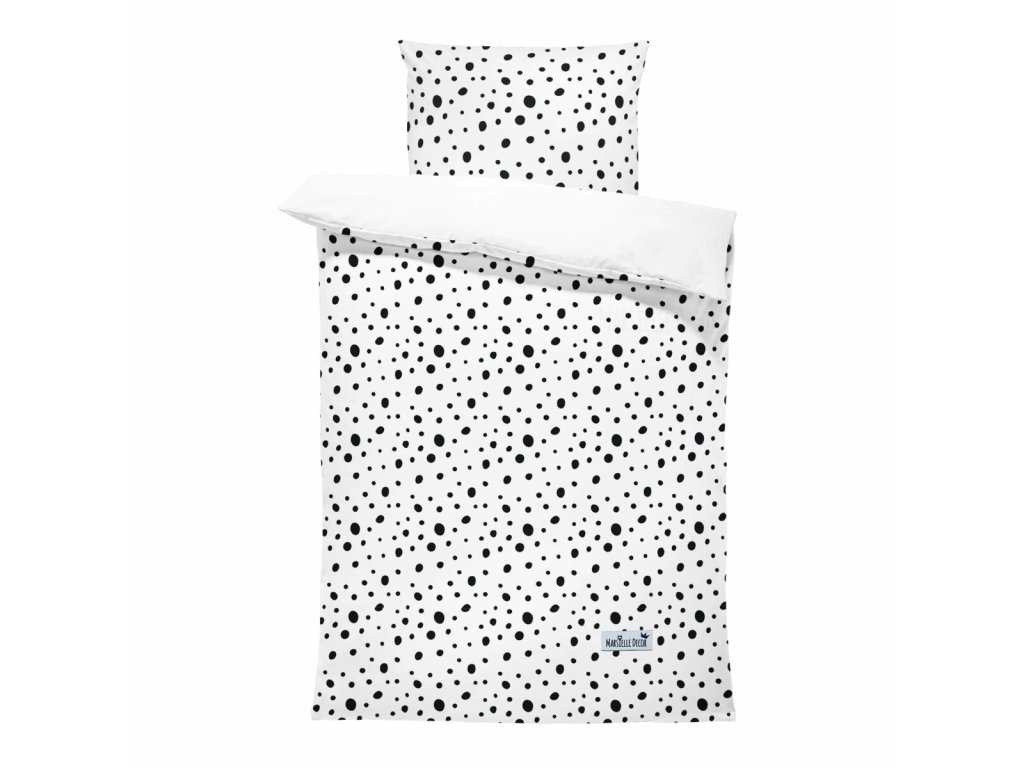 Bílé povlečení s černými puntíky pro děti, vyrobeno z kvalitního a velmi příjemného materiálu, ve kterém se bude všem malým ratolestem krásně spát a odpočívat. Součástí ložního prádla je povlak na polštář a povlak na přikrývku. Povlečení je vyrobeno z přírodní prémiové bavlny se saténovým povrchem. Přikrývka i polštářek jsou z jedné strany s tištěným vzorem, druhá strana je čistě bílá. Praktické zapínání na zip usnadní výměnu ložního prádla. Nekřiklavý a jemný vzor pro klidný a ničím nerušený spánek.