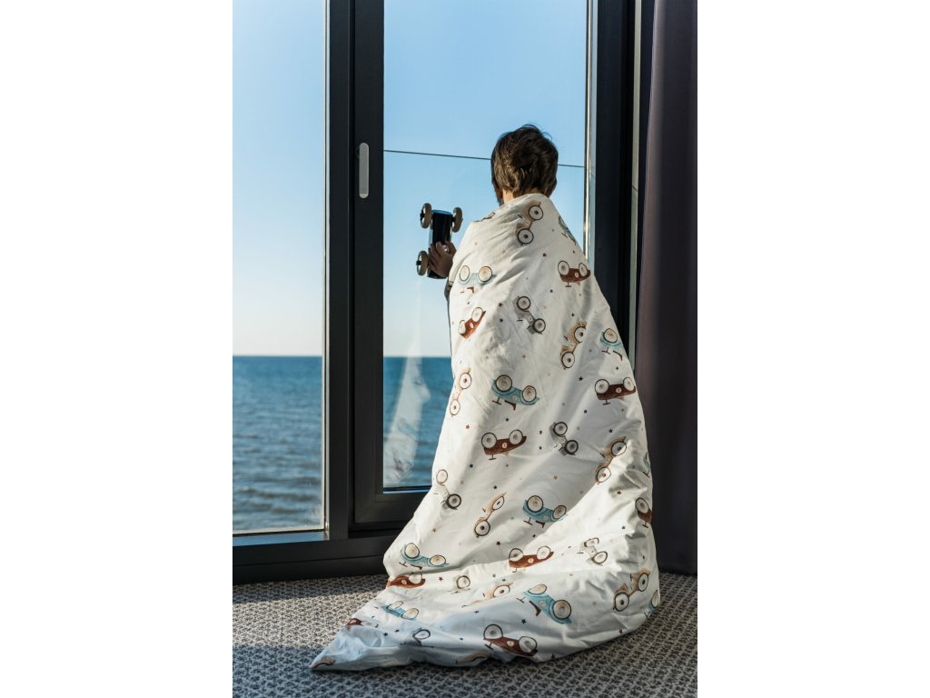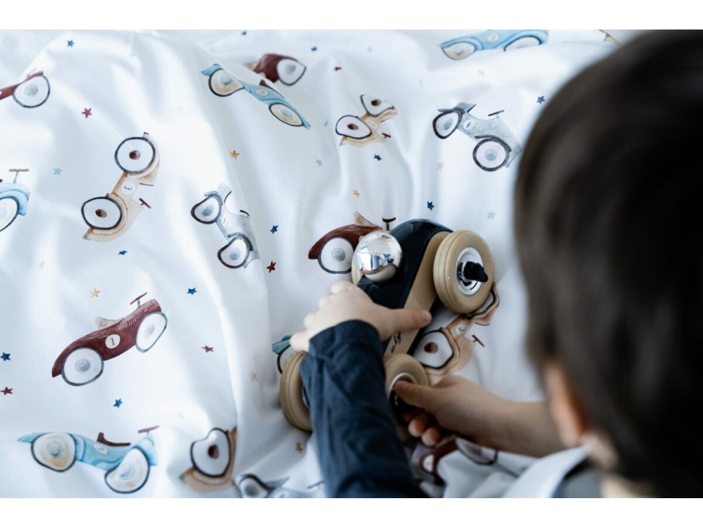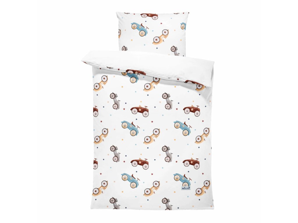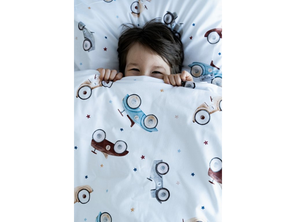 Bílé povlečení s obrázky retro formulí pro děti, vyrobeno z kvalitního a velmi příjemného materiálu, ve kterém se bude všem malým ratolestem krásně spát a odpočívat. Součástí ložního prádla je povlak na polštář a povlak na přikrývku. Povlečení je vyrobeno z přírodní prémiové bavlny se saténovým povrchem. Přikrývka i polštářek jsou z jedné strany s tištěným vzorem, druhá strana je čistě bílá. Praktické zapínání na zip usnadní výměnu ložního prádla. Nekřiklavý a jemný vzor pro klidný a ničím nerušený spánek.