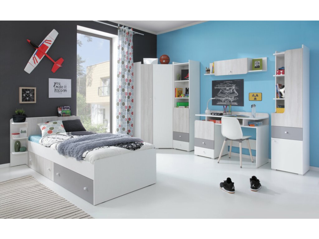 | Sestava se skládá: | rohová šatní skříň Como CM 2 L/P, regál / skříň Como CM 5, regál Como CM 6, psací stůl Como CM 9, závěsná skříňka Como CM 10 , postel Como CM 12 L/P |