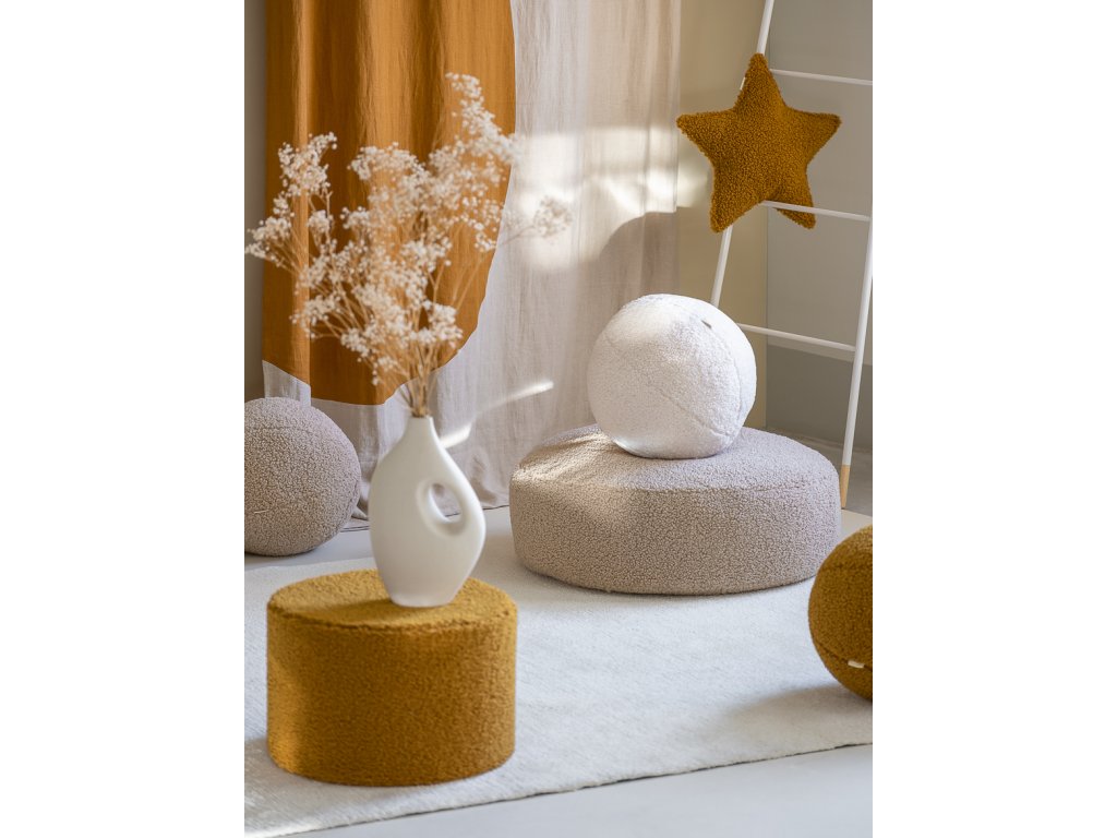Teplý medový odstín působí přirozeně a útulně, takže se snadno kombinuje s moderním i přírodně laděným dětským pokojem. Strukturovaná bouclé látka dodává pufu elegantní vzhled a velmi příjemný pocit při doteku.