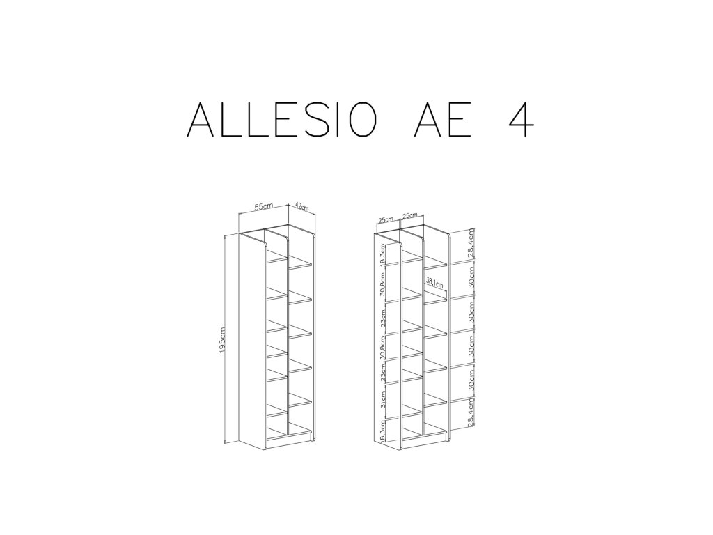 Moderní kolekce nábytku Alessio je zhotovená v odstínu eukalyptové barvy v kombinaci s dubem baltic dune. Designový nábytek splňuje funkční potřeby, ale také slouží jako výrazný prvek interiéru. Nevšedním detailem této kolekce jsou přesahující a vyvýšené okraje, které zabraňují pádu předmětů na zem. Dvířka a zásuvky se otevírají pomocí drobných úchytů. Nábytek stojí na vyšších nožičkách, jež odlehčují celkový vzhled nábytku.