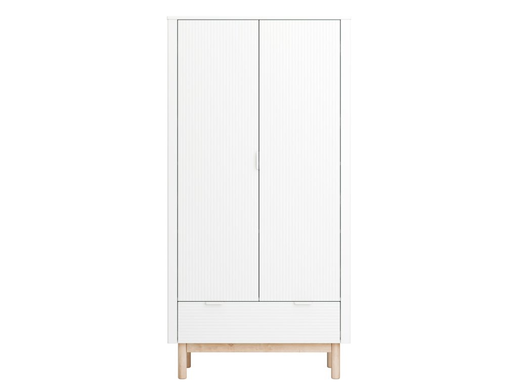 Šatní skříň z kolekce Miloo je rozdělená na prostorné police, šatní tyč k zavěšení oděvů a zásuvku. Prakticky navržený úložný prostor napomáhá k organizaci oblečení, hraček a dalších věcí. Skříň se hodí do dětských pokojů, ložnic i předsíní. Stylová skříň stojí na vyšších nožičkách, jež odlehčí celkový vzhled tohoto kousku.