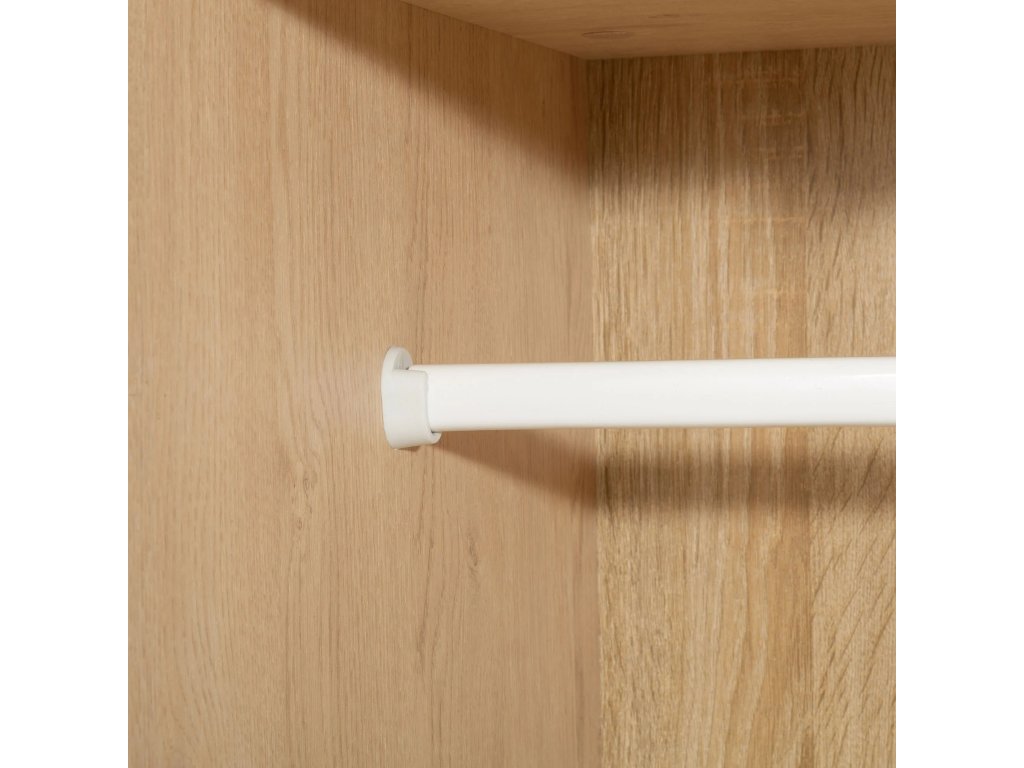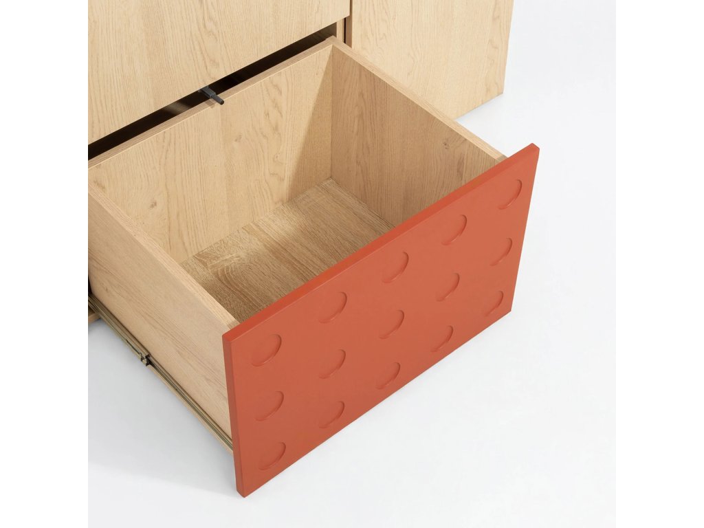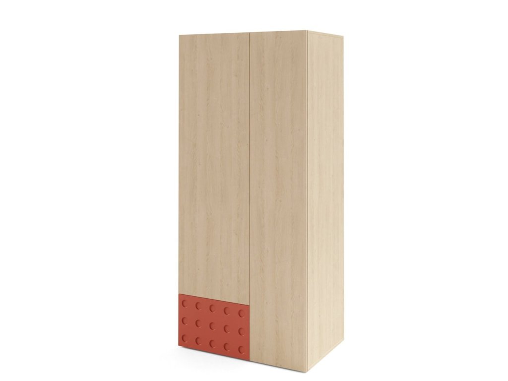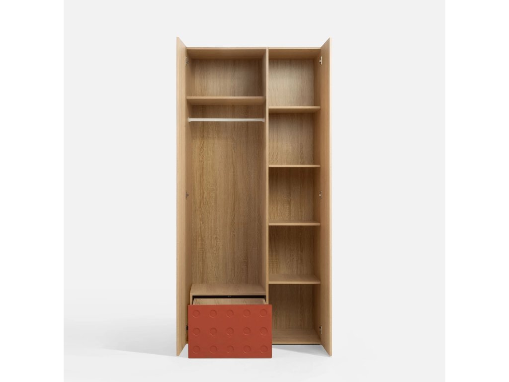 Skříň je navržena jako funkční kombinace policového a šatního úložného prostoru. Levá část nabízí horní širokou polici, šatní tyč pro zavěšení oděvů a ve spodní části výsuvnou zásuvku na menší předměty. Pravá část disponuje pěti praktickými policemi, ideálními na složené oblečení, krabice, hračky či školní potřeby. Plastický oranžový čelní díl zásuvky vytváří hravý akcent, který doplňuje celou kolekci.