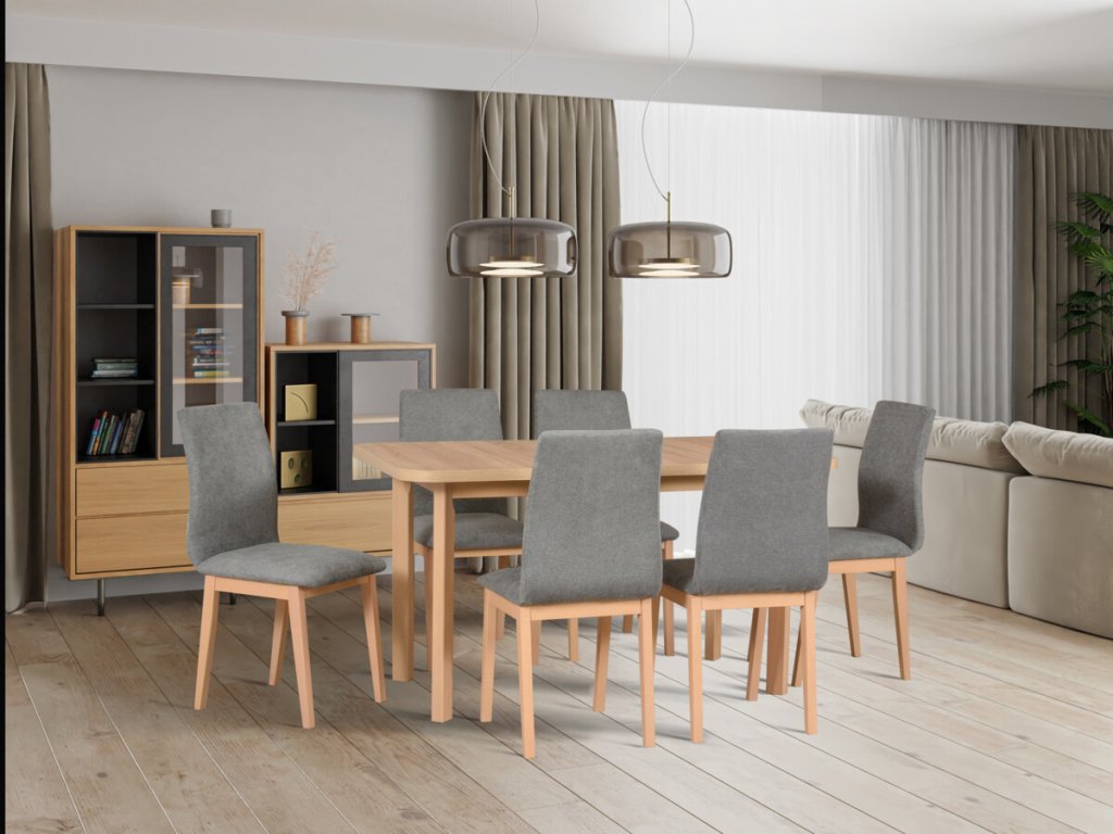 Kvalitní jídelní sestava pro 6 osob vyniká moderní kombinací dřeva a čalounění. Sestava se hodí jak do domácnosti, tak do veřejnýh míst, jako jsou restaurace a kavárny.