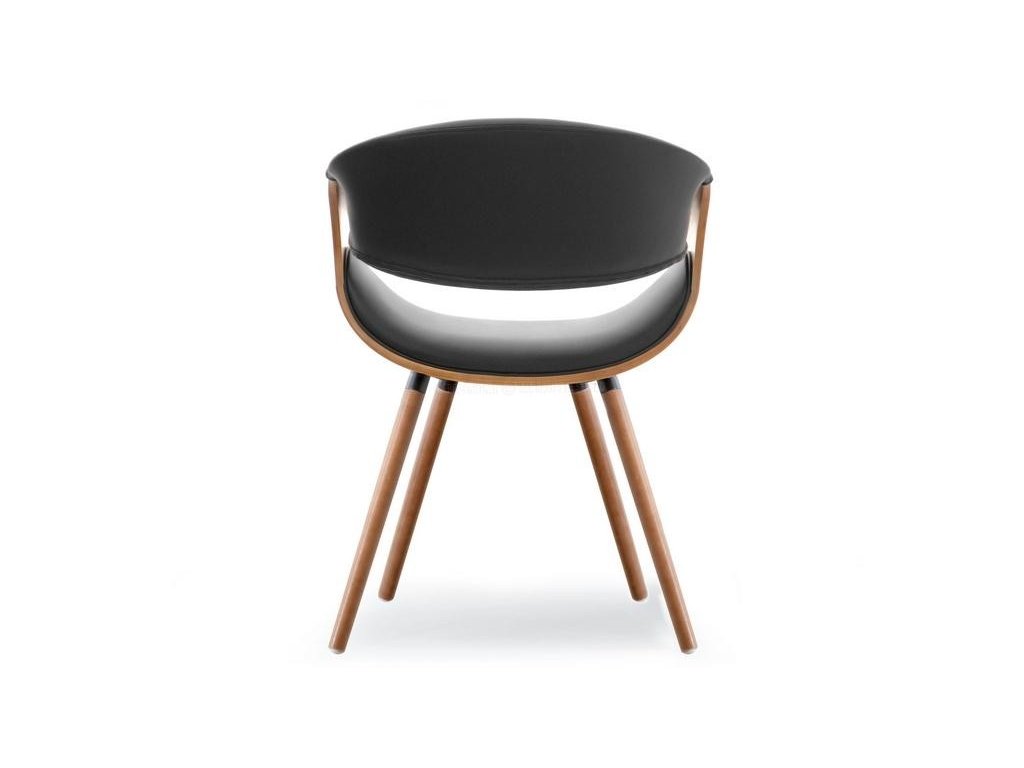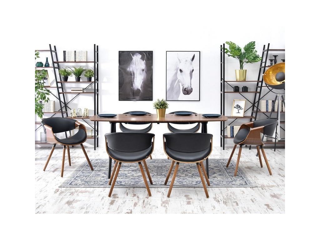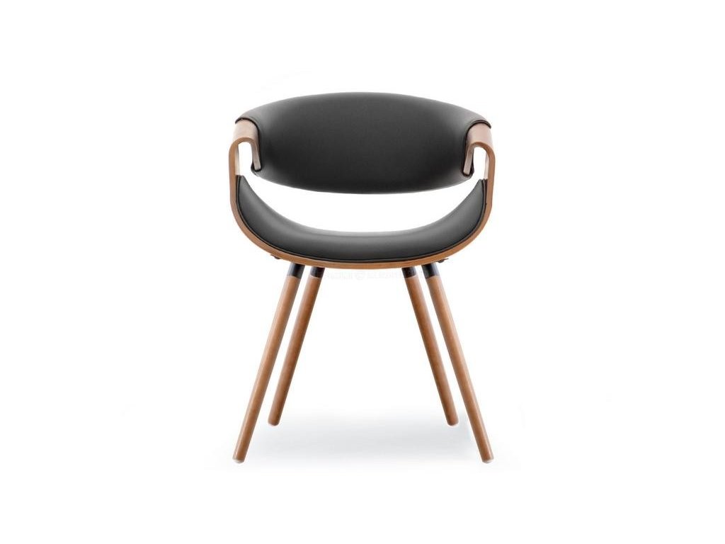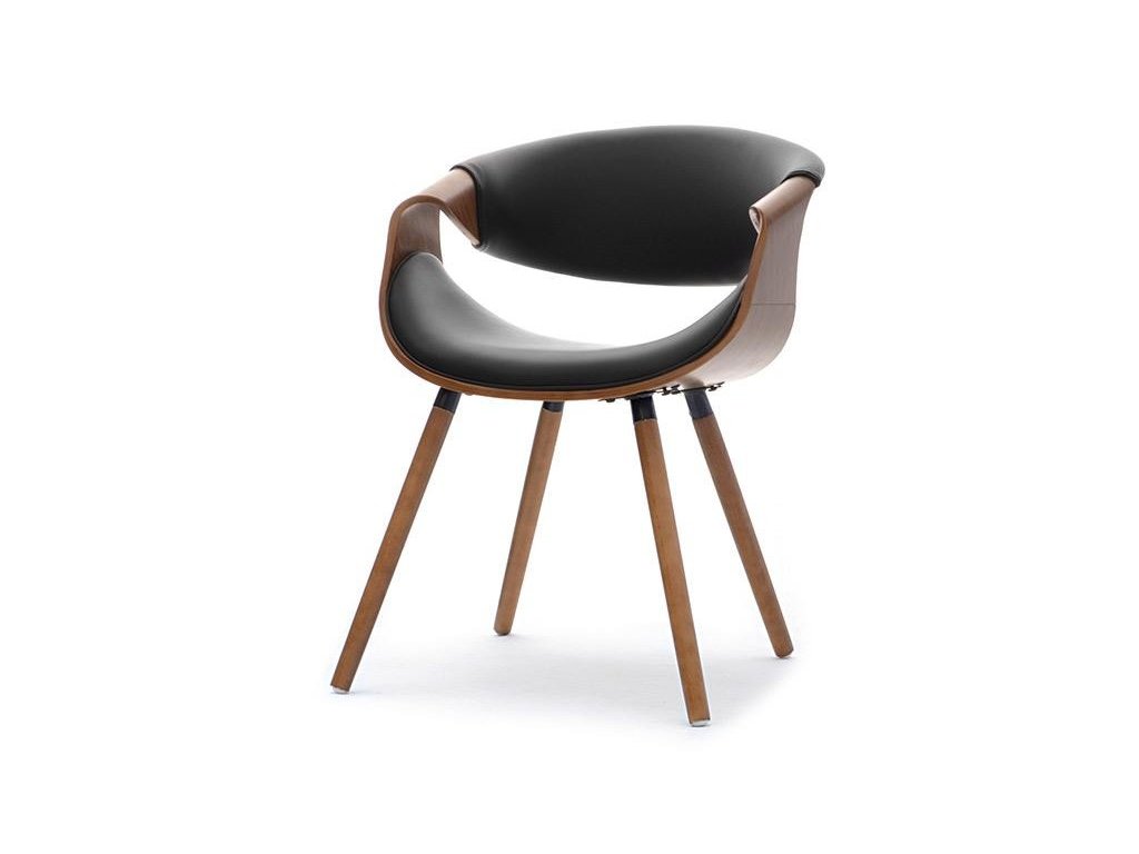 Jídelní židle Bent zaujme elegantní ohýbanou skořepinou z dýhované překližky v ořechovém odstínu, která vytváří příjemně oblé linie. Černá ekokůže působí moderně i luxusně a snadno se udržuje. Jemně tvarovaný opěrák se plynule napojuje na praktické područky, které zvyšují komfort při sezení. Dubová podnož v ořechové barvě doplňuje přírodní vzhled židle a podtrhuje nadčasový skandinávský styl. Sedák i opěrák tvoří jednotnou zaoblenou skořepinu, která pohodlně obejme záda.