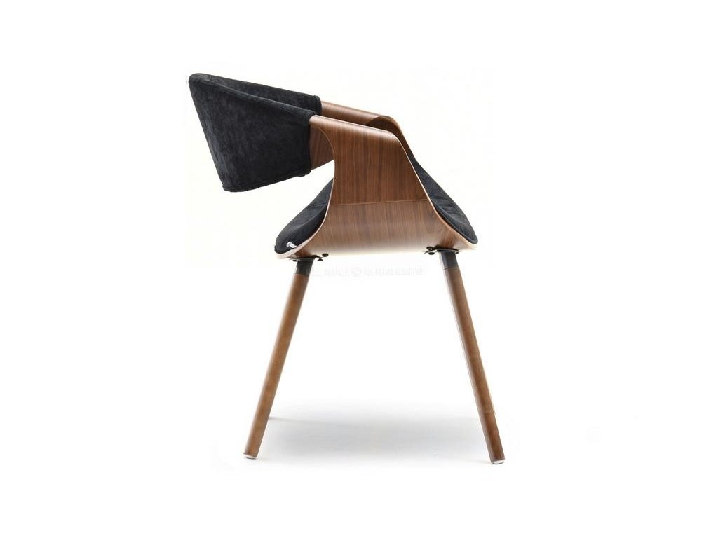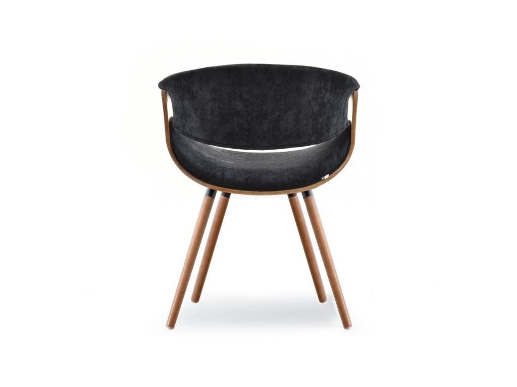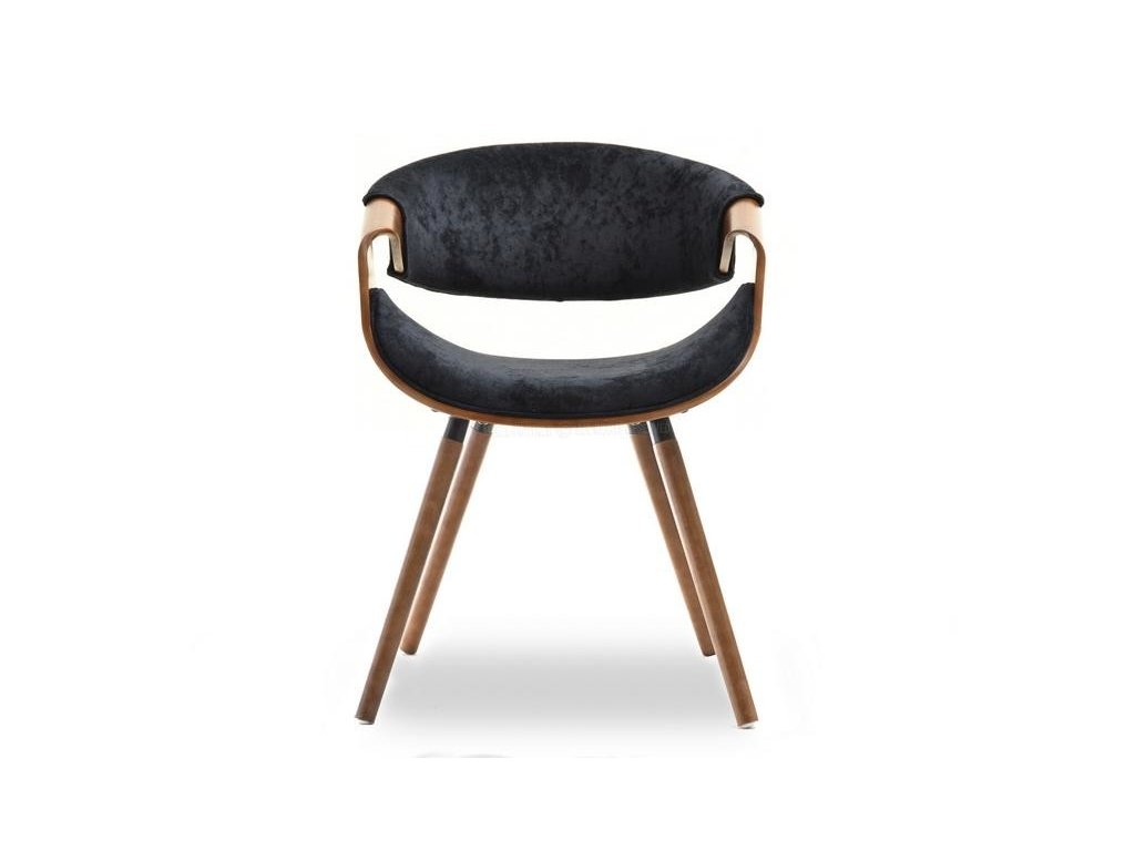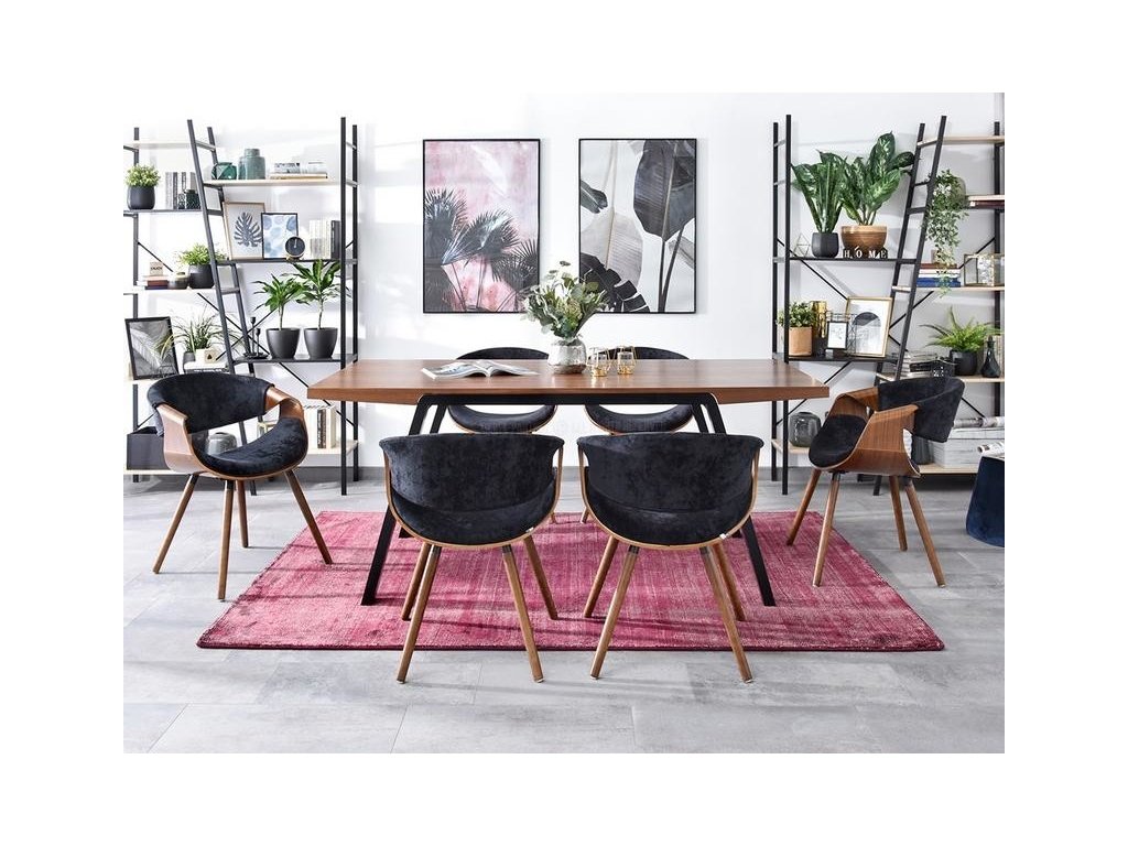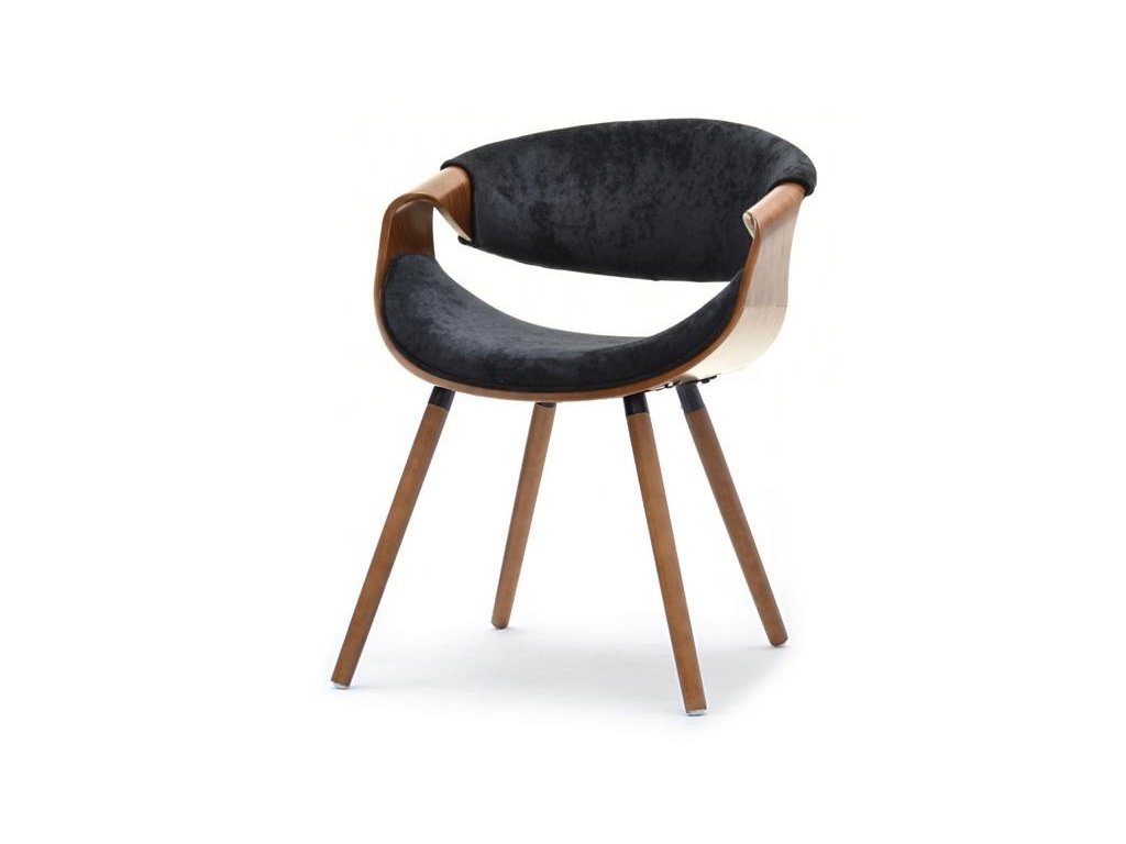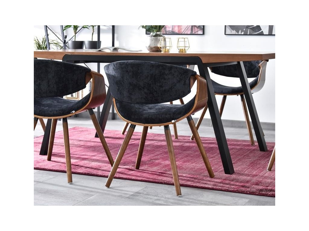 Židle Bent zaujme zaoblenou skořepinou z ohýbané překližky s ořechovou dýhou, která působí elegantně a nadčasově. Černá žinylka dodává židli jemnou texturu a vizuální hloubku, přitom zůstává příjemná na dotek. Sedák i opěrák tvoří jednolitý tvar, který přirozeně obepne záda. Masivní dubová podnož v ořechovém tónu navazuje na přírodní vzhled a podtrhuje moderní skandinávský styl.