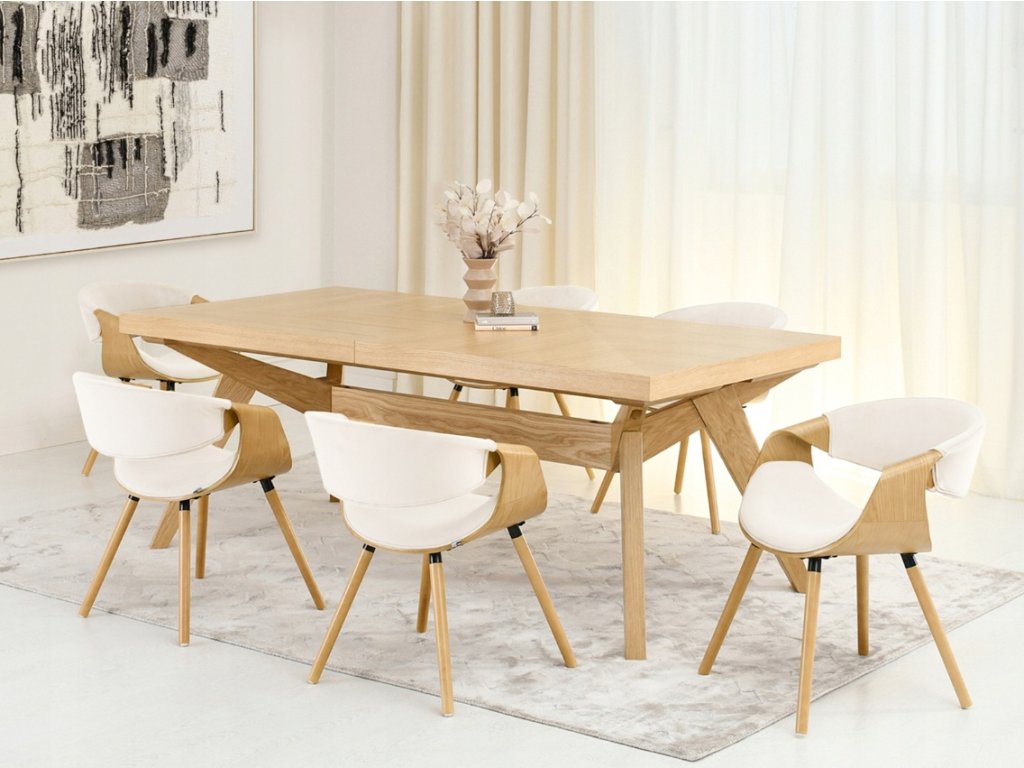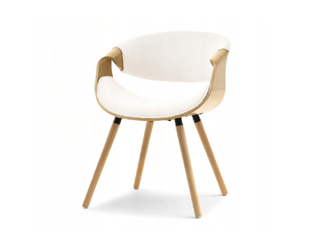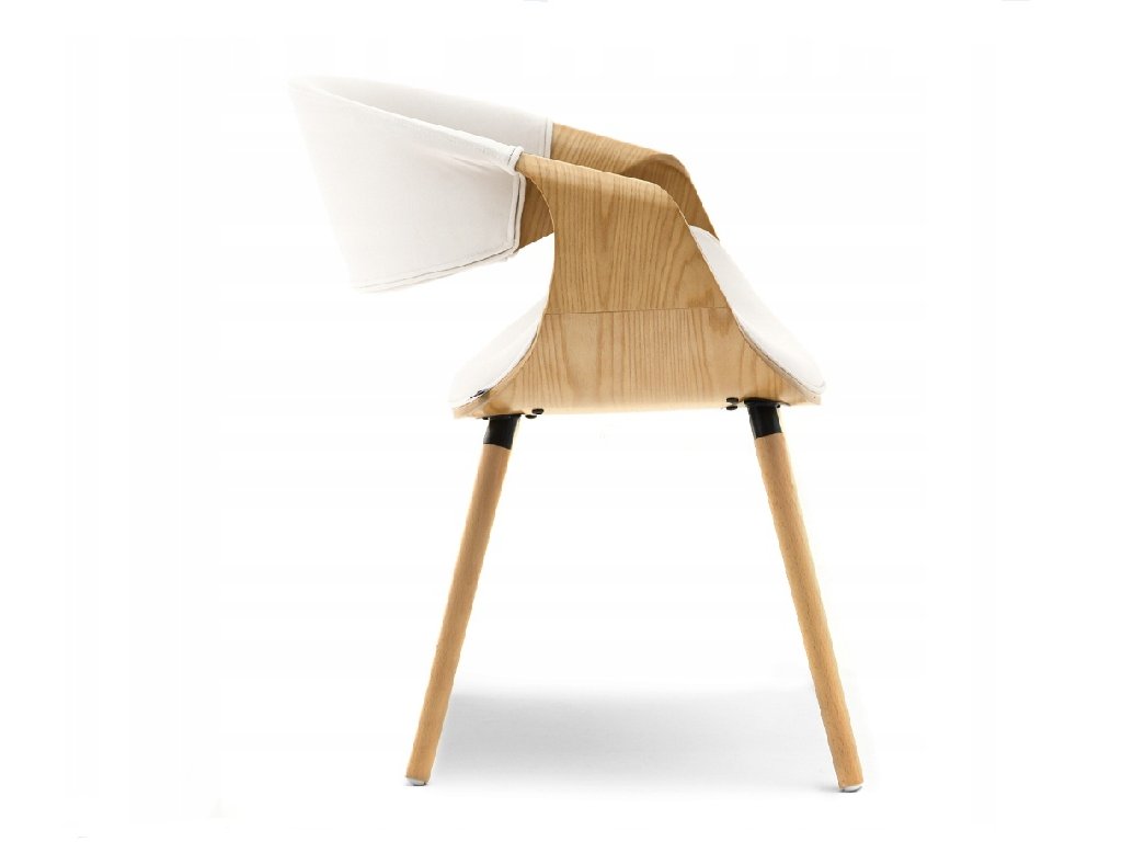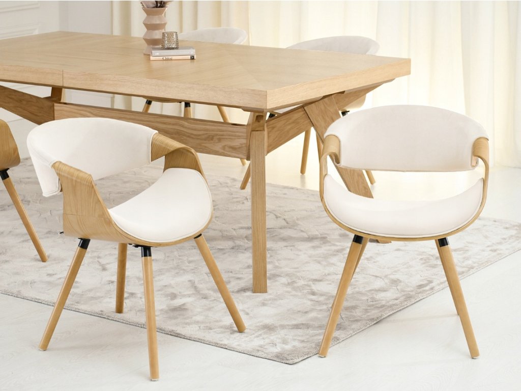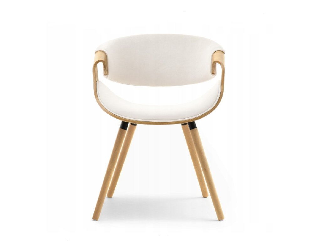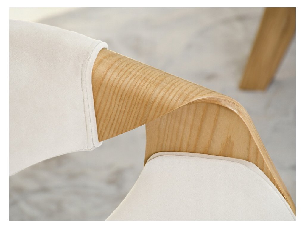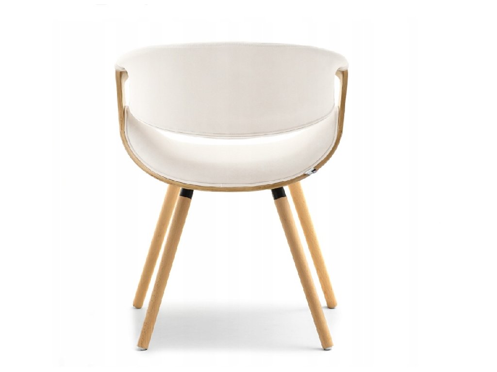Židle Bent zaujme elegantní ohýbanou skořepinou z dýhované překližky, která vytváří příjemně oblé linie. Krémový velur působí teple a dodává židli luxusní vzhled a jemně tvarovaný opěrák se plynule napojuje na područky. Dubová podnož zdůrazňuje přírodní charakter a skandinávský styl. Sedák i opěrák tvoří jednolitou zaoblenou skořepinu, která příjemně obejme záda.