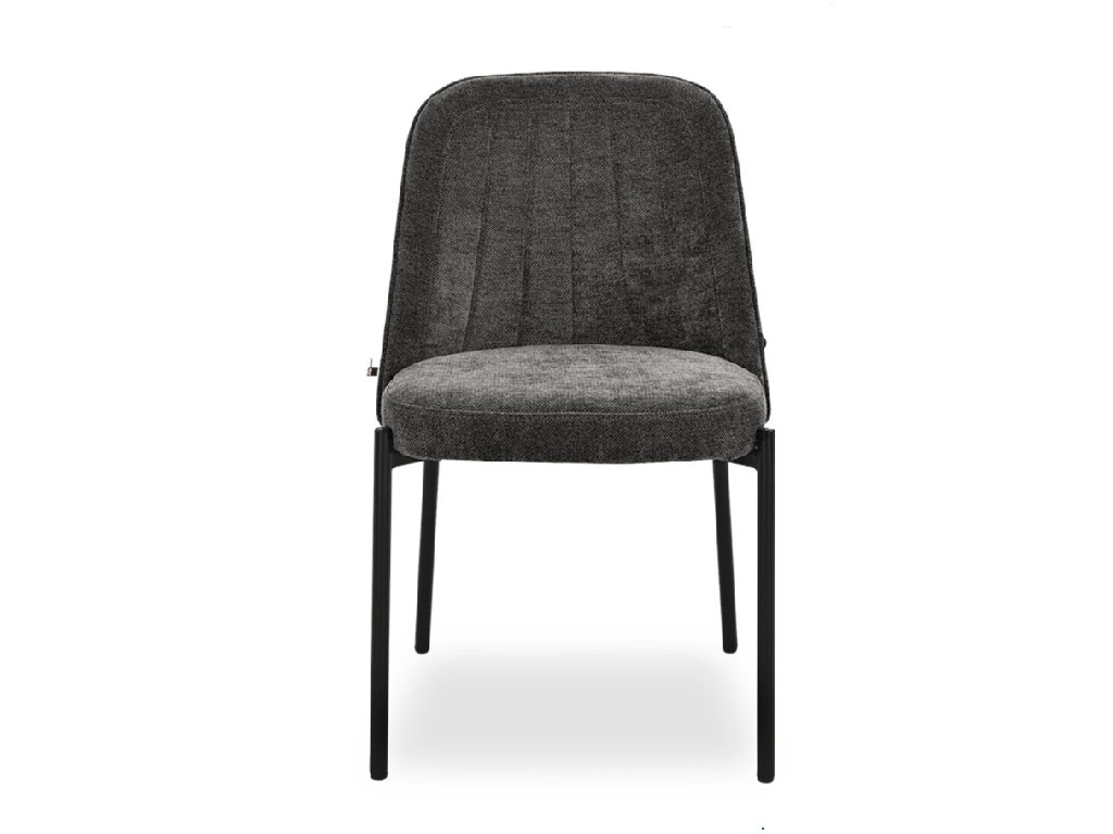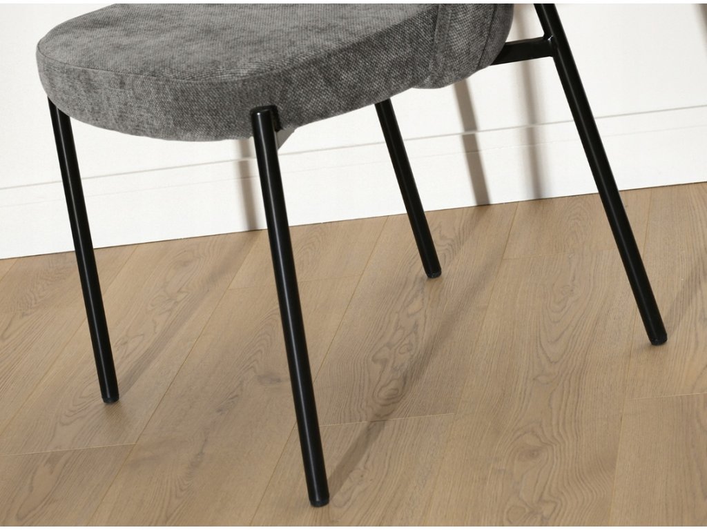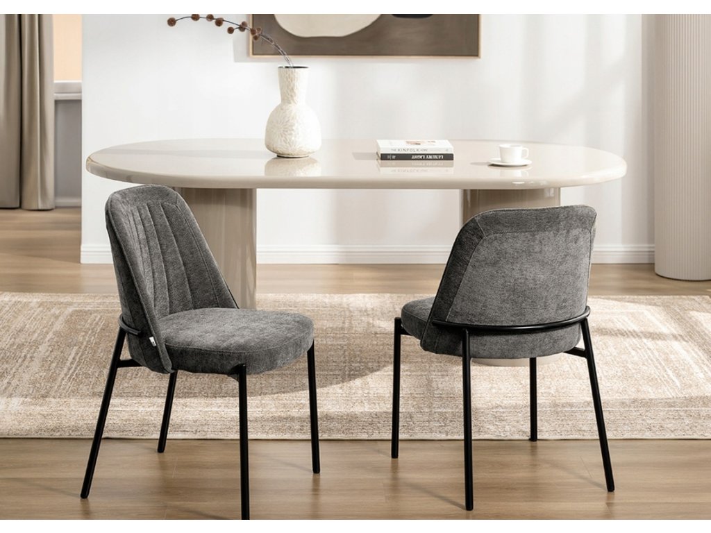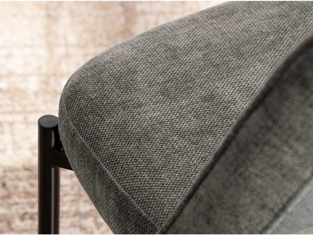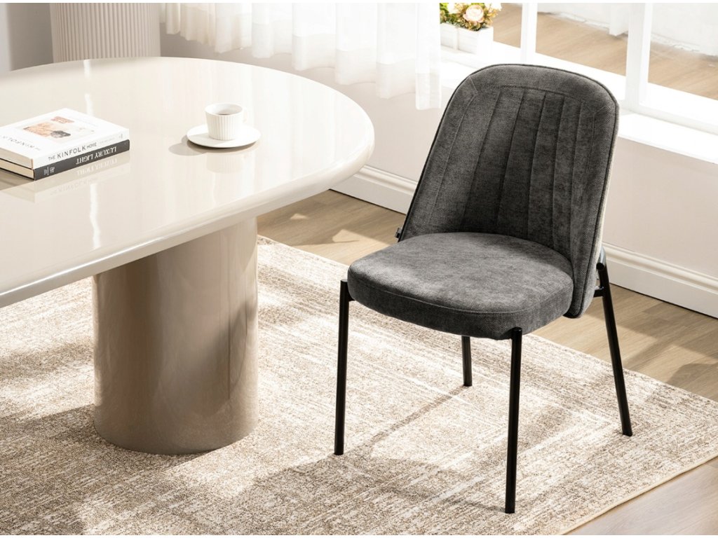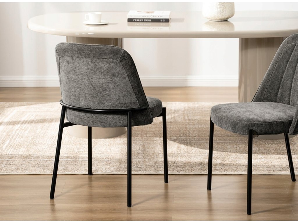 Jídelní židle Ernest je navržena s důrazem na jednoduchý tvar, pohodlí a nadčasový vzhled. Bez područek umožňuje snadné zasunutí ke stolu a působí nenápadně i v menších prostorech. Tmavě šedá čalounická látka vytváří elegantní kontrast s černou kovovou konstrukcí a snadno se kombinuje s různými typy nábytku.