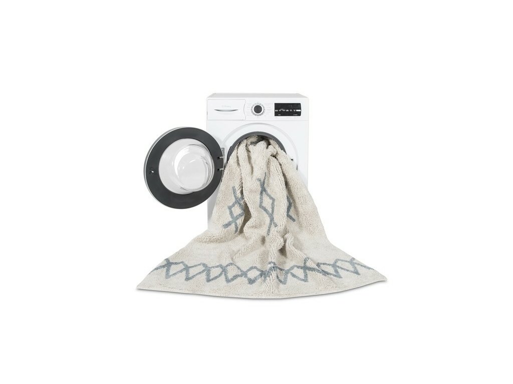 Koberec ve světlé - přírodní barvě s neokoukaným modrým vzorem poslouží i jako měkoučké místo na sezení a prostor k dětským hrám. Že by se mohl ušpinit? To vůbec nevadí, stačí koberec vyprat v pračce a bude zase jako nový.