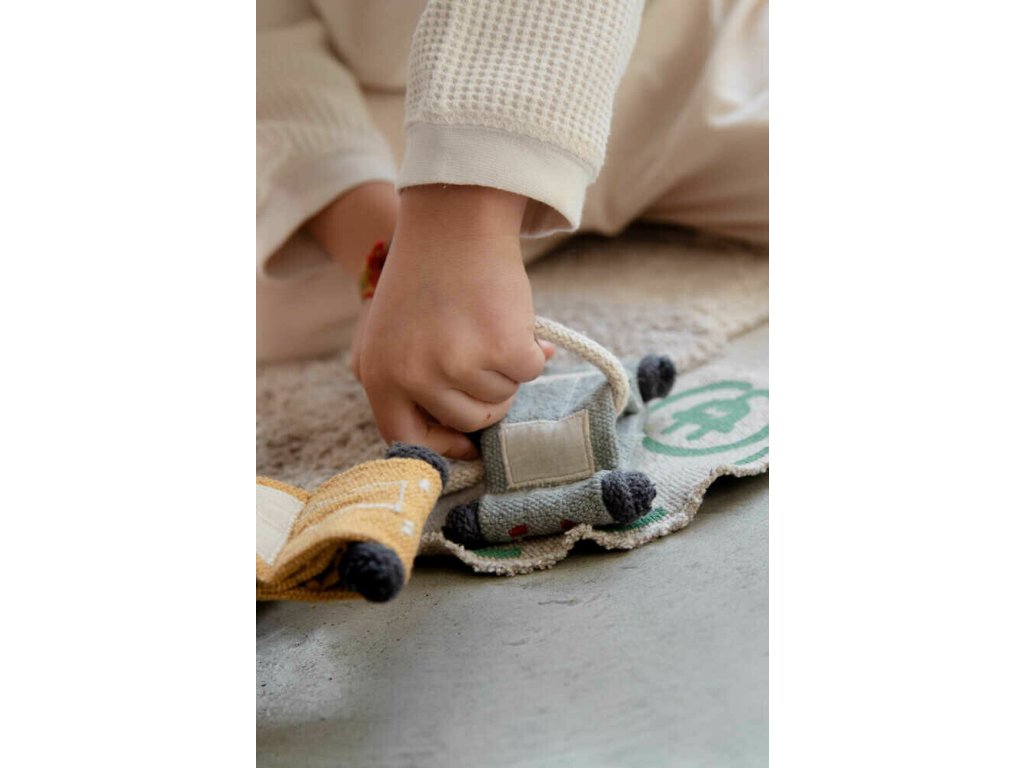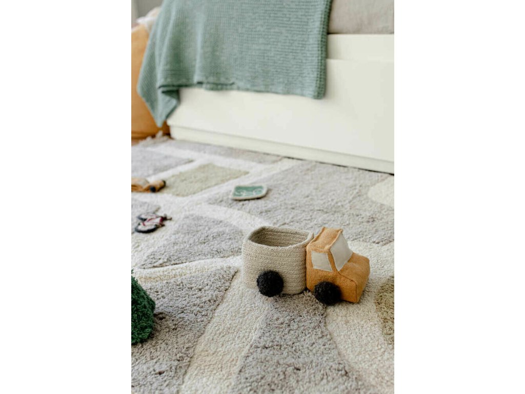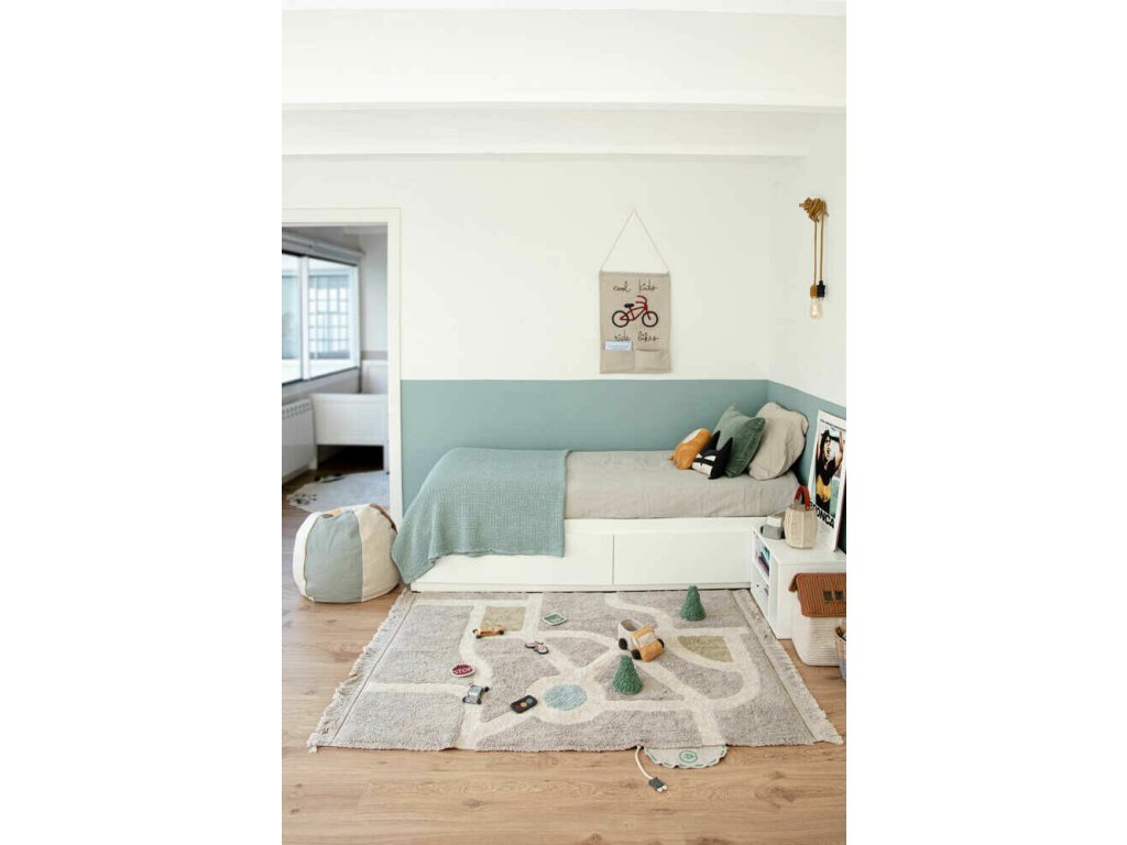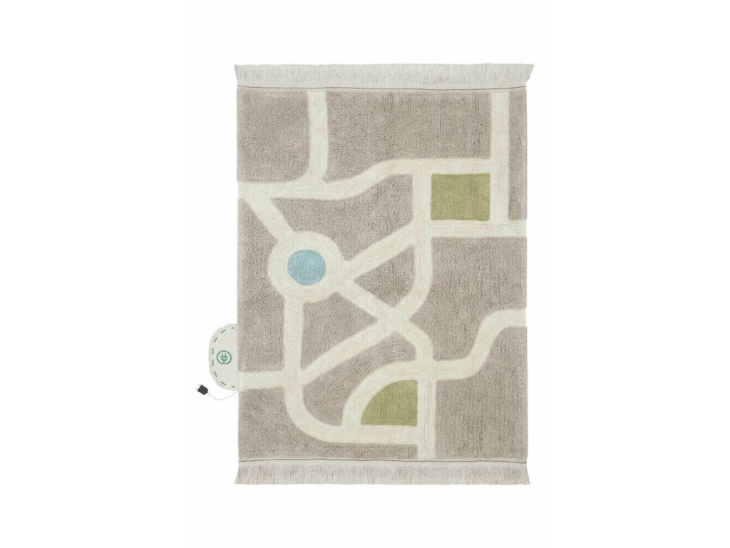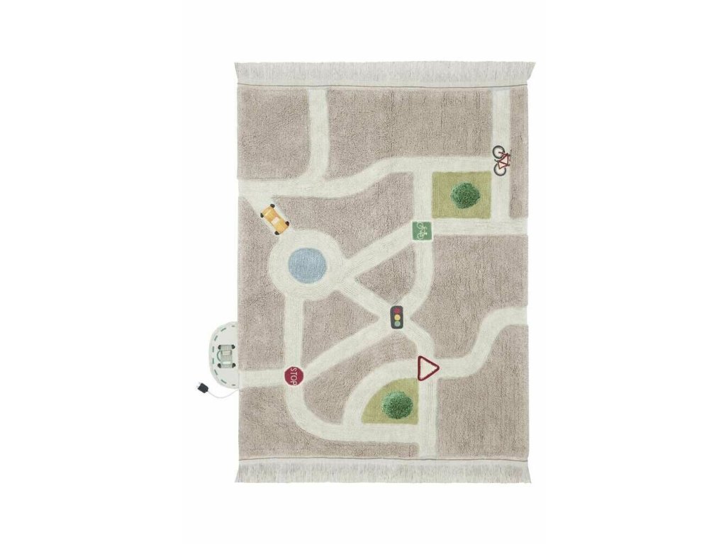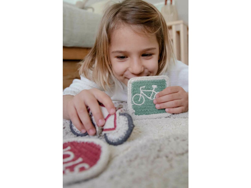 Koberec je hřištěm pro děti, znázorňuje mapu města se silnicemi a stezkami. Spolu s kobercem je součástí i 9 ručně šitých hraček - auta, stromy, dopravní značky a kolo, jež mohou děti po koberci přemísťovat v rámci svých her. Velmi originální zpracování a skvěle využitý koberec pro menší i starší děti.