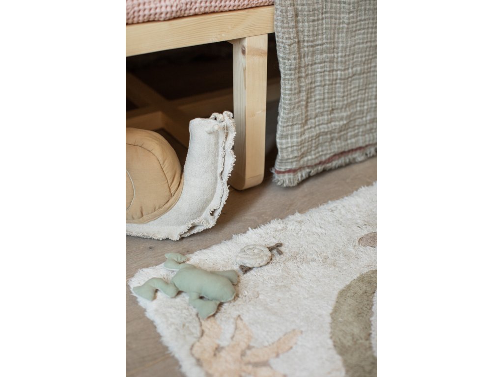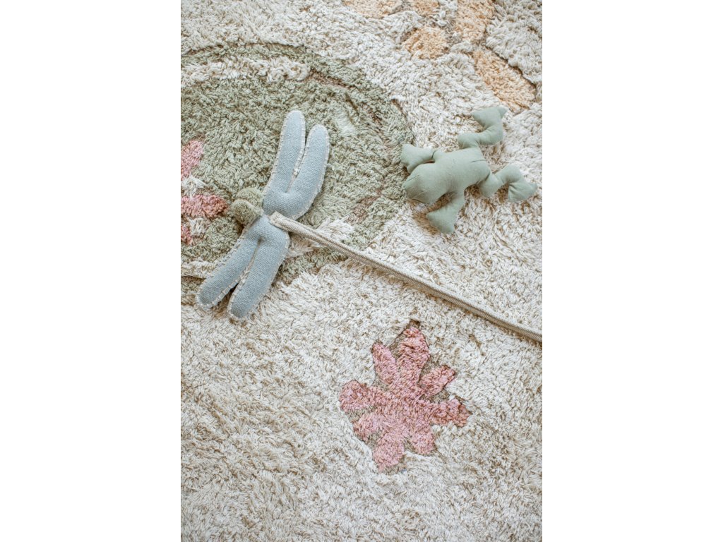 Koberec s motivy botanické zahrady je plný jezírek, leknínů, vážek a rákosu. Po koberci může hopsat bavlněná žába, jež je dodávaná spolu s kobercem. Tento kousek je stylovým doplňkem do pokojíčku, na němž si mohou děti hrát a poznávat přírodu.