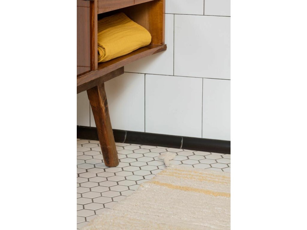 Měkoučký koberec v přírodní, světle medové, tmavě medové, jantarové barvě snadno zakomponujete do každého interiéru. Koberec má v každém roku třásně spletené do copánku. Díky možnosti praní v pračce jej můžete umístit i do venkovních prostor.