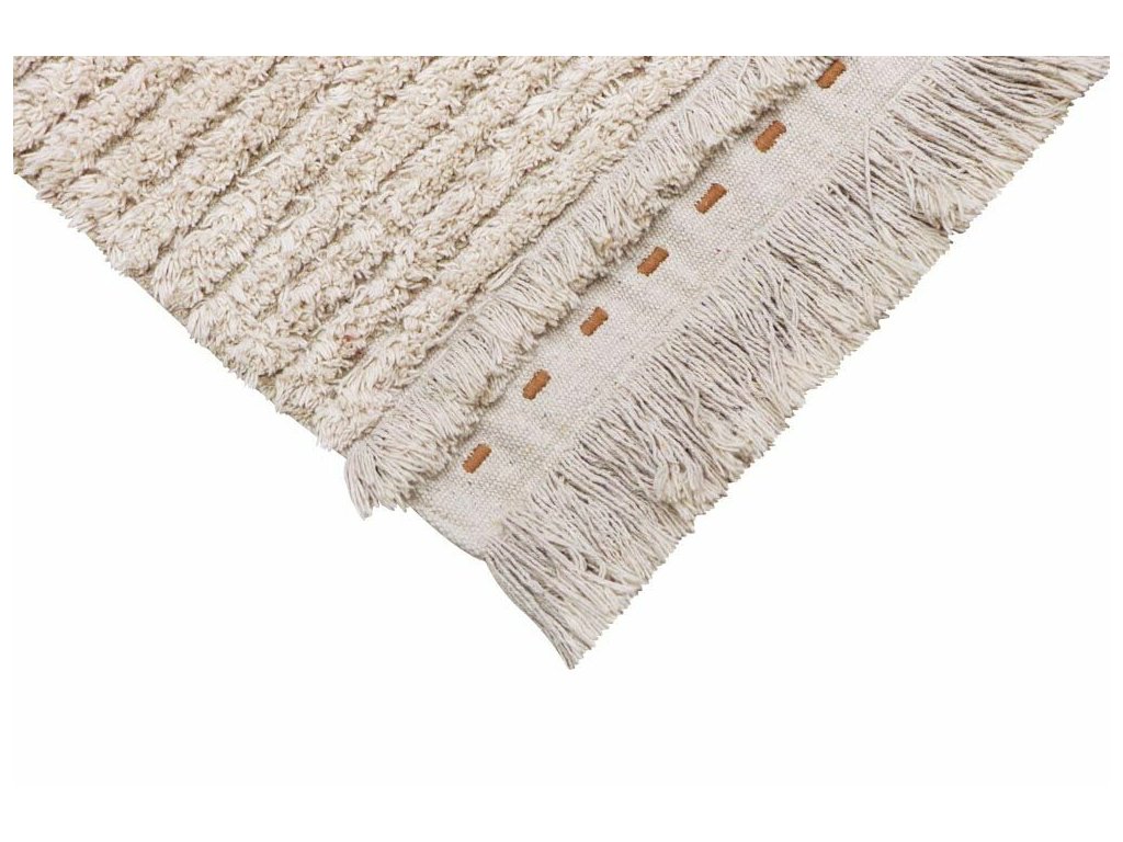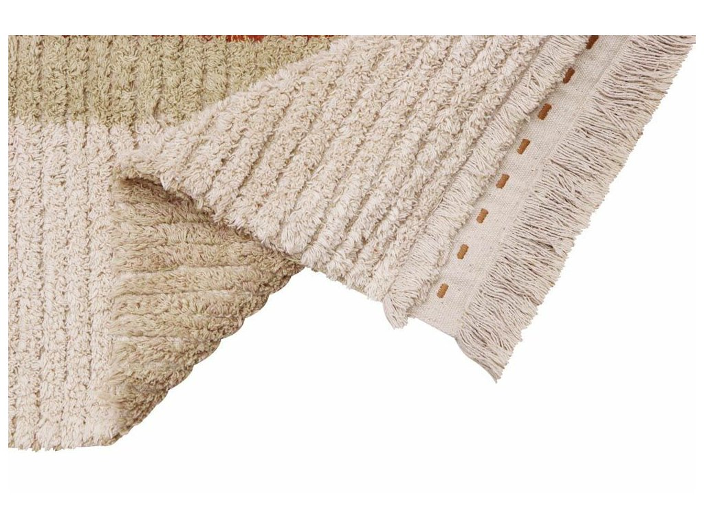 Měkoučký koberec s třásněmi v přírodní, terakotové, šalvějové a olivové barvě snadno zakomponujete do každého interiéru. Díky možnosti praní v pračce jej můžete umístit i do venkovních prostor.