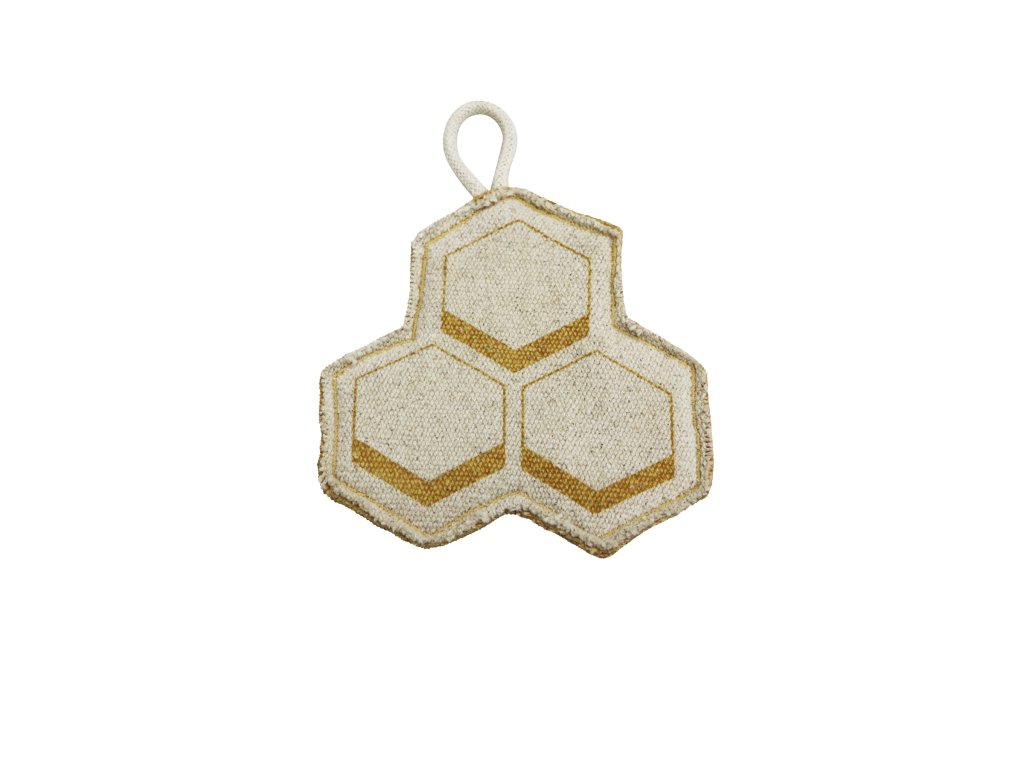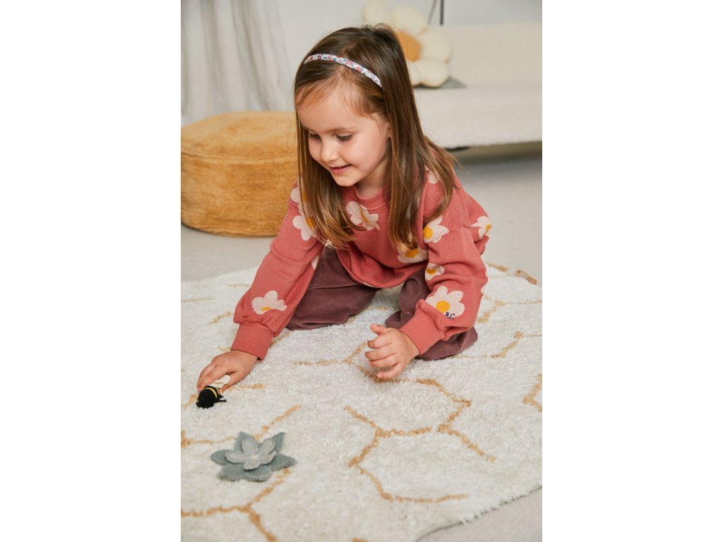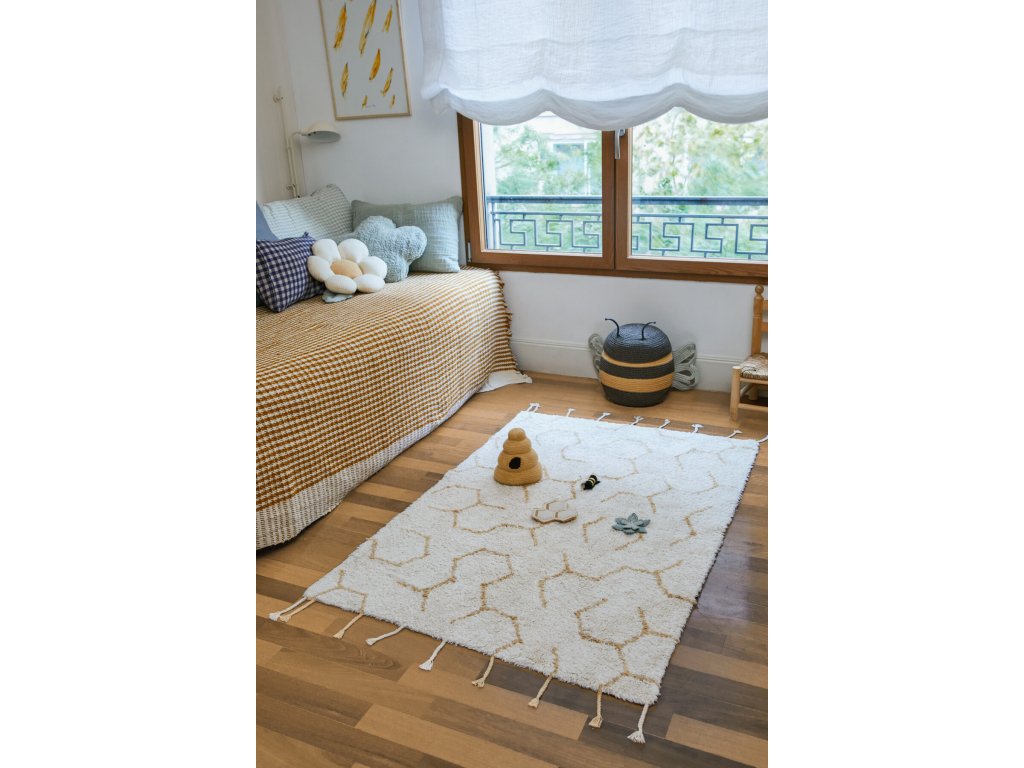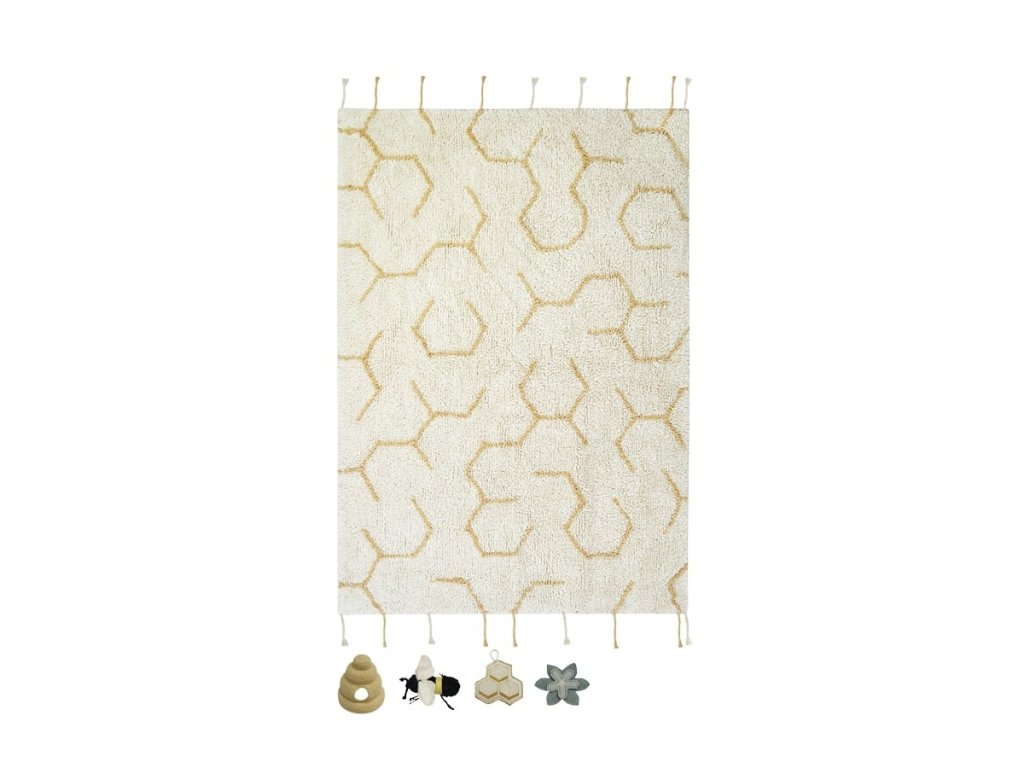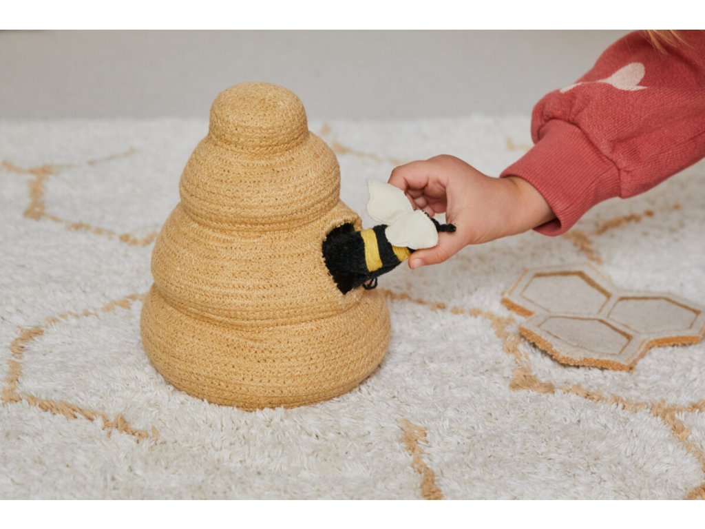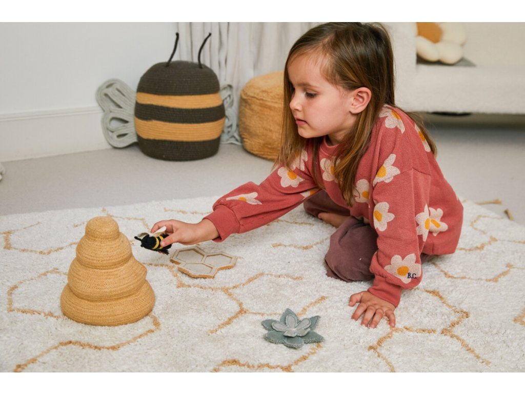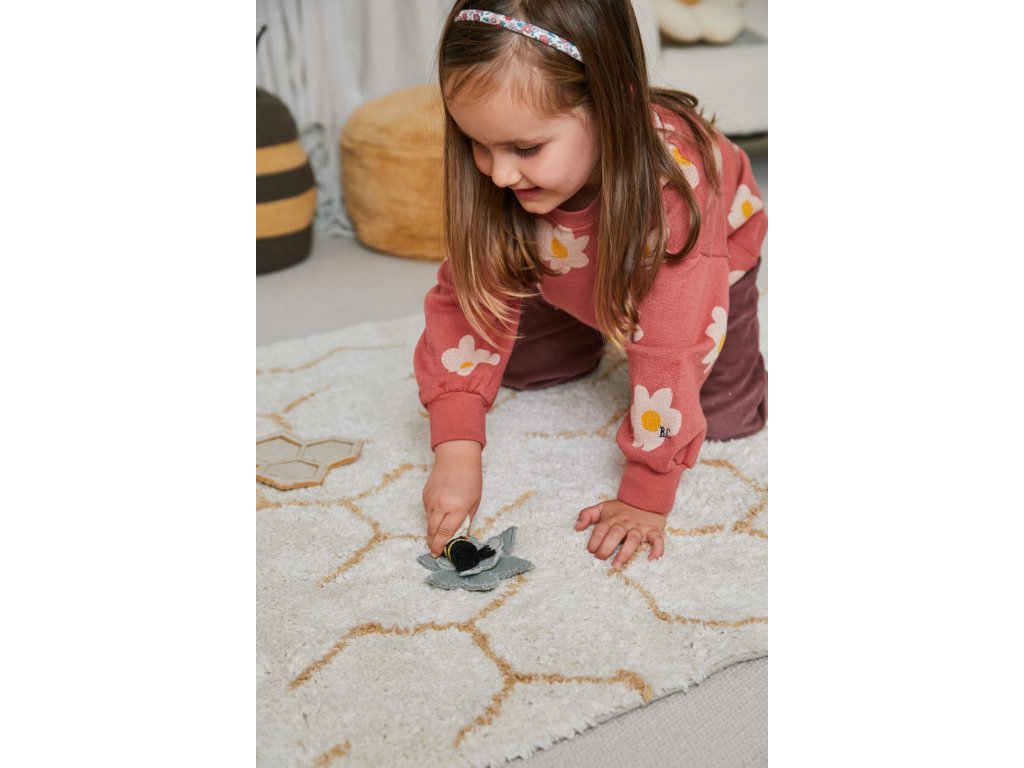 Koberec v moderním slonovinovém odstínu je ozvláštněný o vzory v medové barvě, jež připomínají včelí plásty. Kratší strany zakončují třásně ze zapletených copů. Tento kousek se skvěle hodí do různých pokojů, především do těch dětských. Součástí jsou totiž čtyři hračky - včelí úl, květ šalvěje, plást a včelka. Hračky znázorňují proces opilování. Děti se při hře naučí něco nového ze života včel.