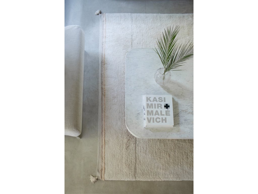 Koberec Bloom v přírodím odstínu světle béžové je vhodný do obývacích pokojů, ložnic i pokojů pro děti a miminka. Jednobarevný desing s jemně se měnící výškou vlasu dodává pruhovanou strukturu. Koberec má v každém rohu stylový střapec. Tento kousek je dalším z řady RugCycled - rug = koberec a upcycled = upcyklace. Termín upcyklace označuje proces, při němž je odpadový materiál, v případě koberců zbytky recyklované bavlny, přeměňován na nové materiály lepší kvality. Myšlenkou celé výroby je co nejvyšší kvalita s nejmenším možným negativním dopadem na životní prostředí.