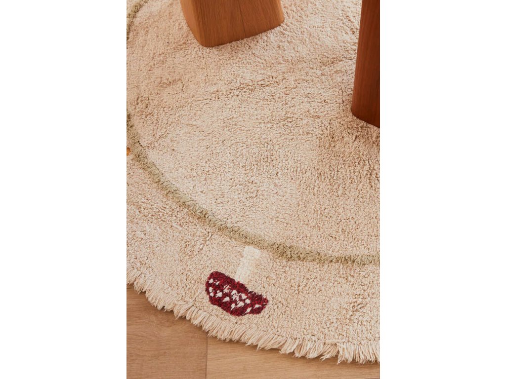 Kulatý koberec zakončený úzkým pruhem třásní je utkaný z nejjemnější přírodní bavlny v odstínech olivové, slonovinové a medové barvy. Nepřehlédnutelné detailem jsou obrázky hub, jež perfektně ladí do celé kolekce. Koberec tvoří nenahraditelný doplněk i místo na hraní a odpočinek.