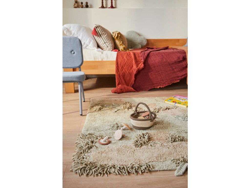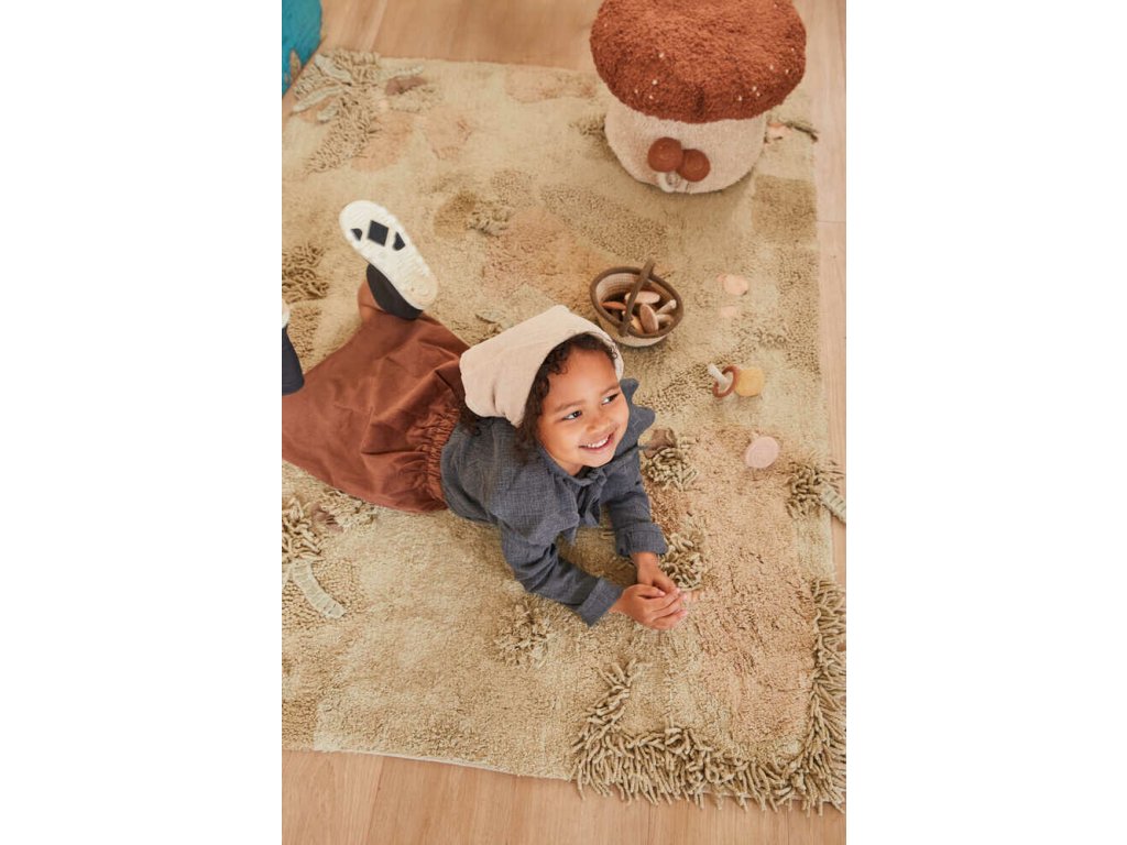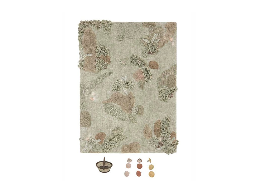 Koberec znázorňuje podzimní les plný mechu, kapradí, spadaného listí, kde mohu děti hledat houby. Spolu s kobercem jsou totiž součástí houby a aby byly kam sbírat, nechybí ani bavlněný košíček. Velmi originální zpracování a skvěle využitý koberec pro menší i starší děti.