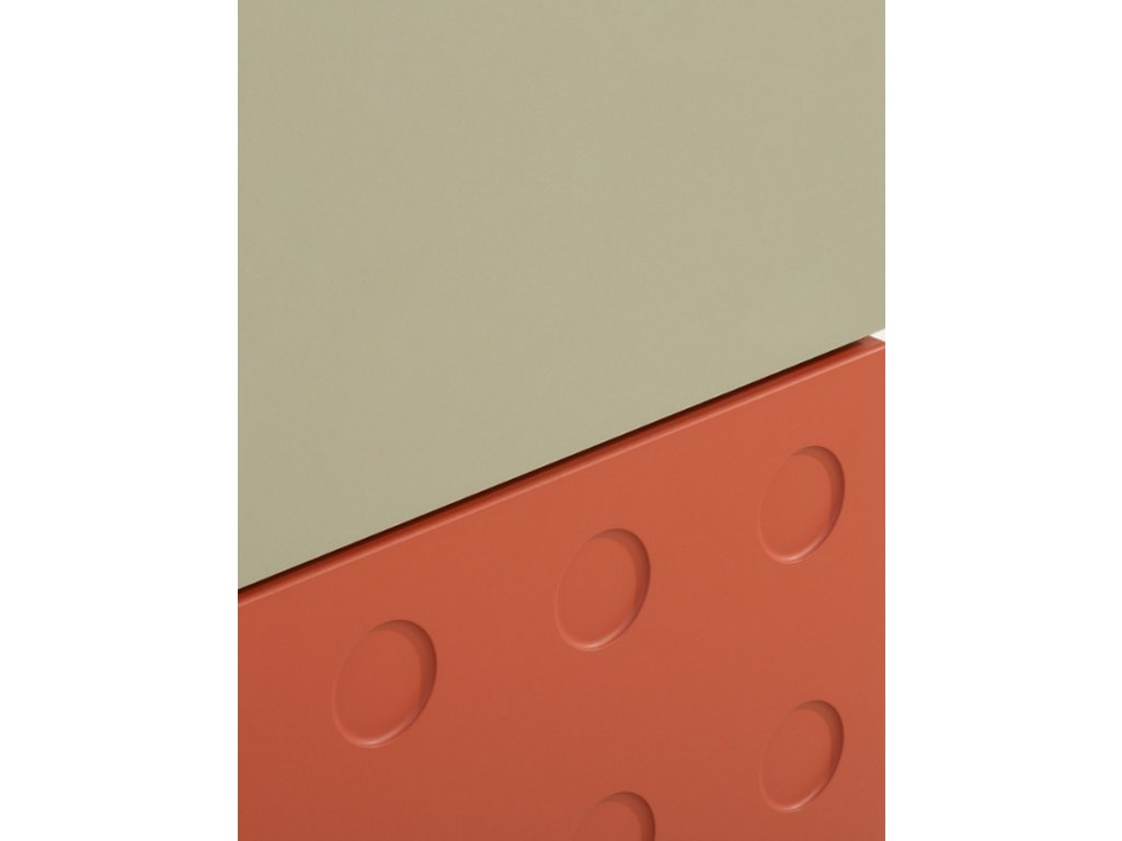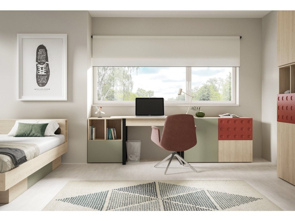 Kolekce Salsa spojuje světlý dubový dekor s jemným eukalyptovým odstínem a výrazným cihlovým prvkem připomínajícím LEGO stavebnici. Díky této kombinaci působí svěže, hravě a je ideální do dětských a studentských pokojů. Jednotlivé prvky lze mezi sebou snadno kombinovat a vytvářet ucelené moderní sestavy.