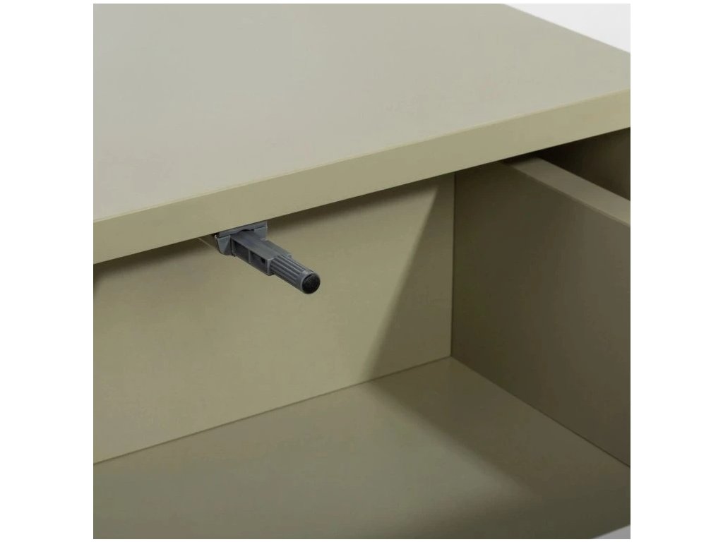 Komoda je za třemi dvířky rozčleněna na tři funkční úložné úrovně. Horní sekce nabízí širokou otevřenou polici, vhodnou pro knihy nebo boxy. Střední úroveň je dělená na dvě menší přihrádky, které umožňují přehledné ukládání drobných předmětů, her nebo školních potřeb. Spodní část tvoří jeden velký prostor bez dělení. Díky variantě L/P lze komodu při montáži orientovat s umístěním cihlového panelu vlevo nebo vpravo.