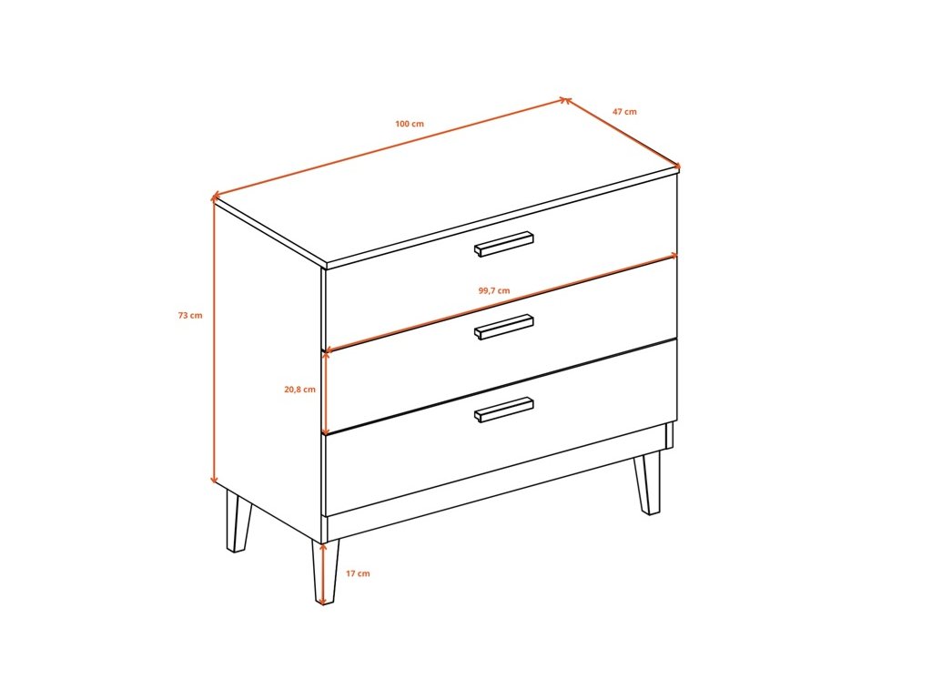 Klasická komoda disponuje úložným prostorem ve třech zásuvkách. Komoda bude skvělým pomocníkem k uspořádání různých věcí a udržení pořádku v obývacích pokojích, ložnicích a pracoven. Vrchní deska komody je ve stejném odstínu jako úchyty a nohy, tvoří tak stylový doplněk k šedému odstínu zásuvek.