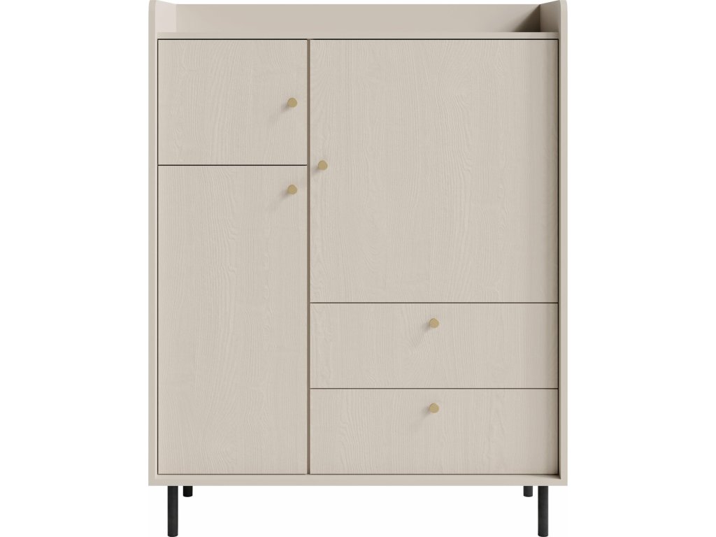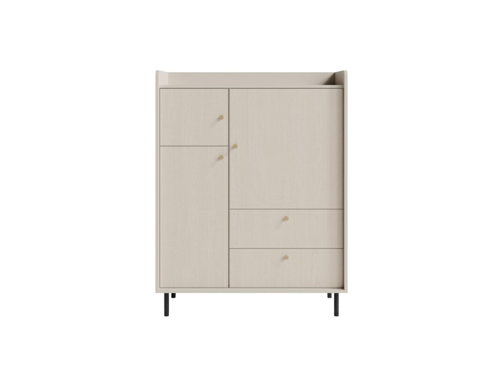 Vyšší komoda z kolekce Grande má prakticky rozdělený úložný prostor na zásuvky a zavřené police. Zajímavé rozdělení doplňují stylové nožičky a úchyty. Vrchní deska komody je jako dělaná k umístění bytové dekorace, stolního osvětlení či pokojových květin.