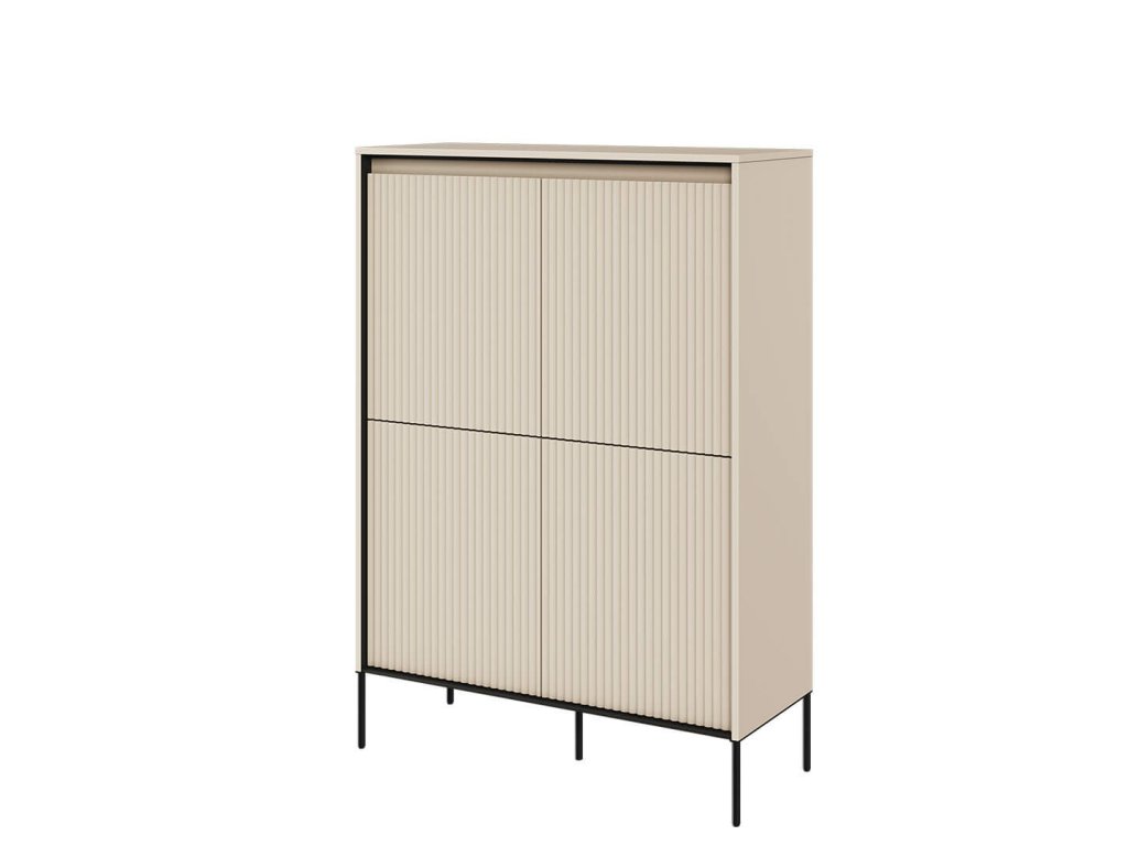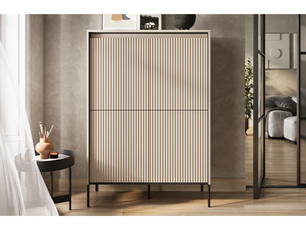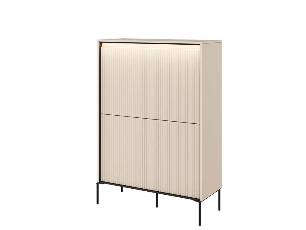 Zajímavým detailem tohoto kousku je žebrování na dvířkách, vyšší kovové nožičky a v neposlední řadě i LED osvětlení pod horní deskou, které vytvoří příjemnou atmosféru v prostoru.