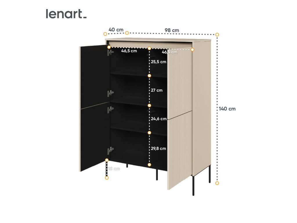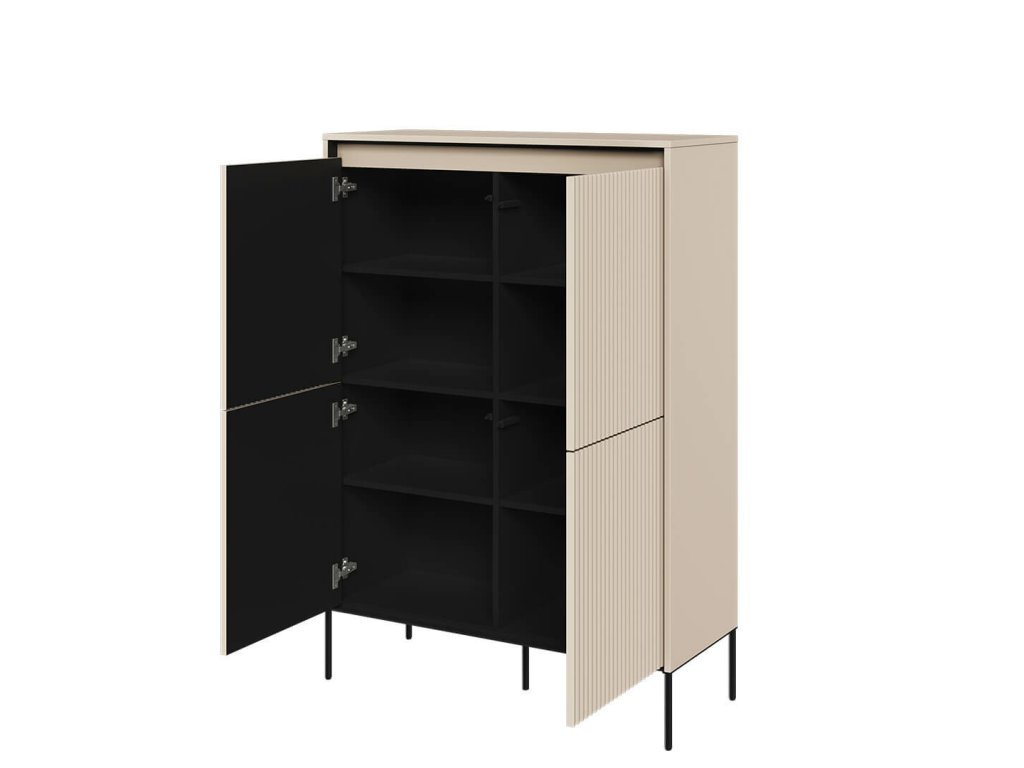 Úložný prostor ve vyšší komodě Trend je rozdělený na šest polic za stylovými dvířky. Do komody je možné umístit různé věci a postavit ji téměř do všech pokojů. V obývacím pokoji poslouží k odkládání knih, deskových her a dekorace. V ložnici k uspořádání oblečení a ložního prádlo a v chodbě k uschování čepic, tašek a batohů.