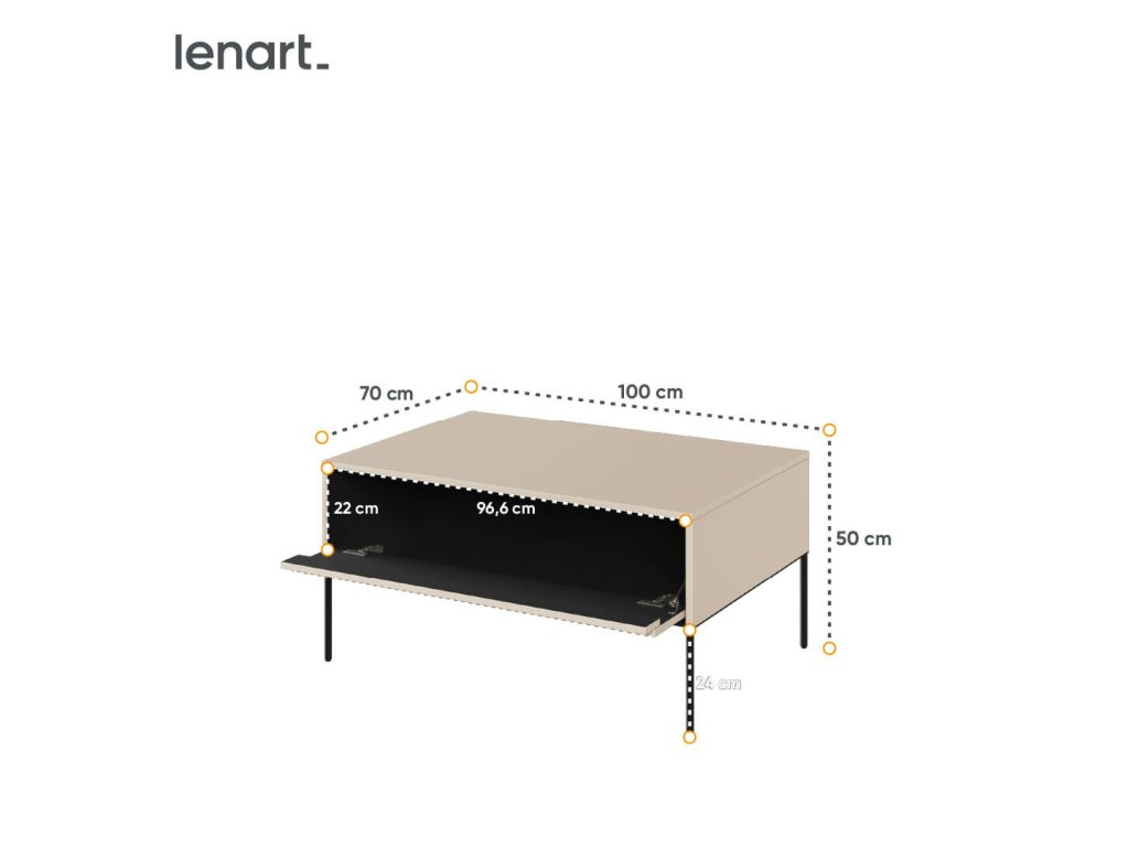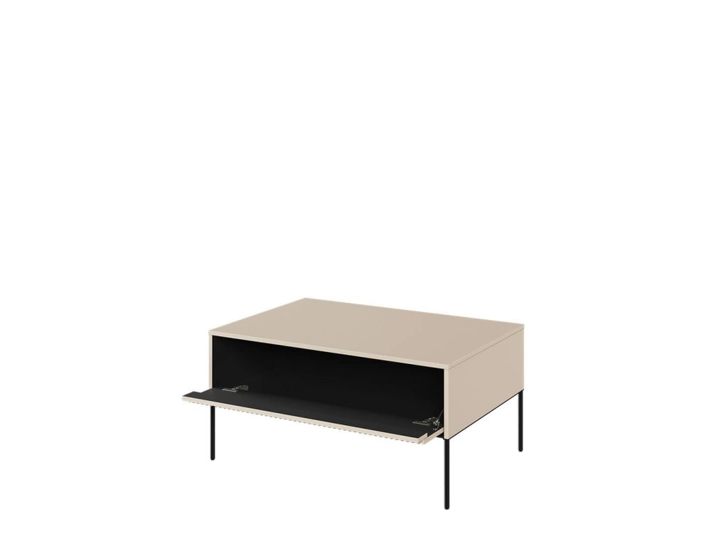 Stolek disponuje úložným prostorem v zásuvce. Dvířka zásuvky jsou výklopná, otevírají se systémem push to open - praktický a funkční způsob pro nábytek bez úchytů.