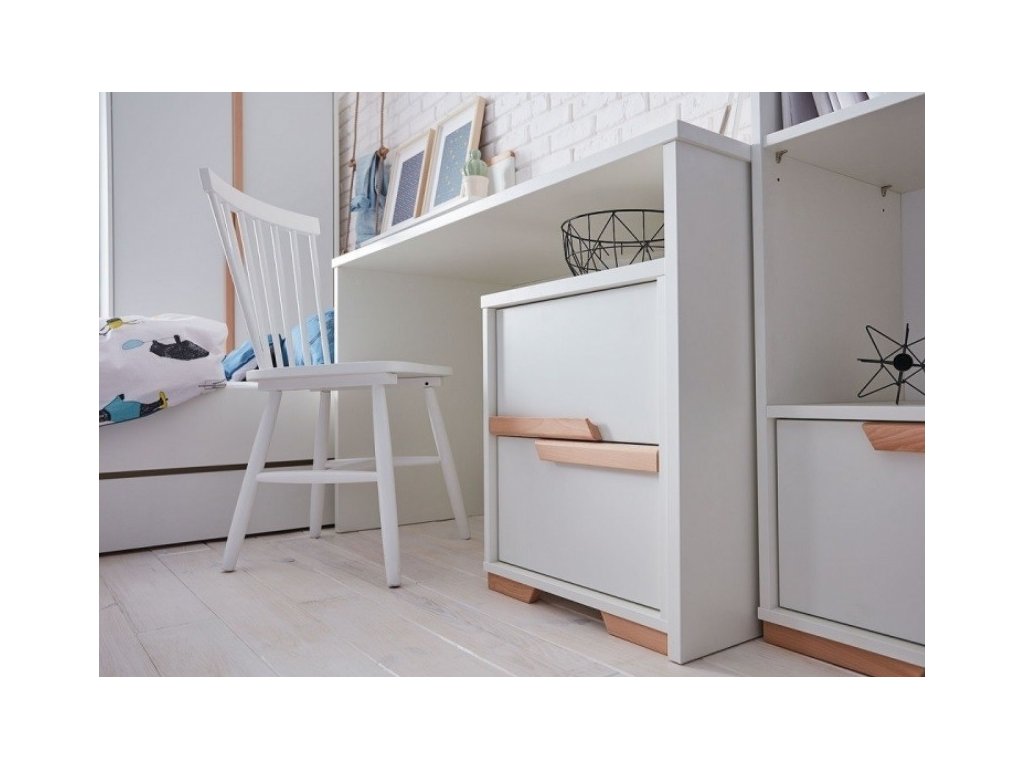 Kombinace jemné bílé barvy v polomatném provedení a prvků z masivního bukového dřeva vytváří čistý, moderní a zároveň útulný vzhled. Kontejner působí lehce a přirozeně, snadno se kombinuje s ostatním nábytkem a je vhodný do pokoje pro novorozence, batole i školáka.