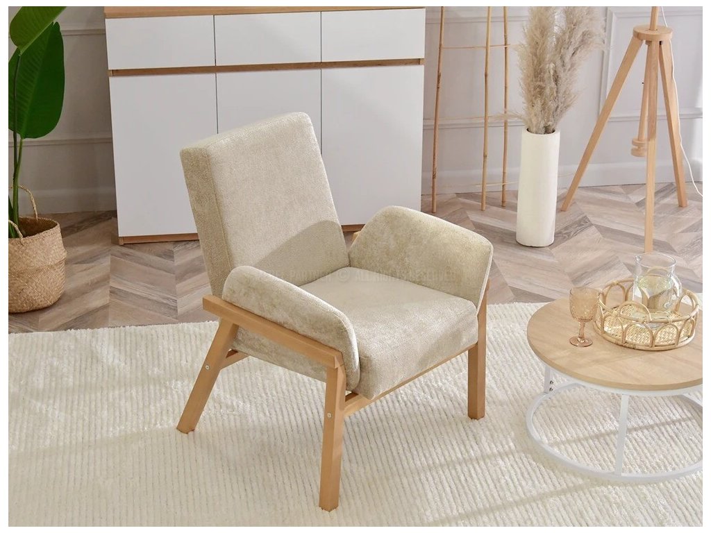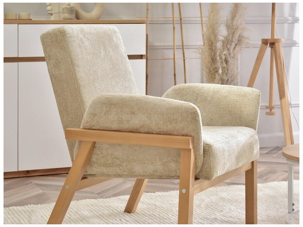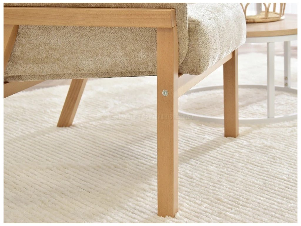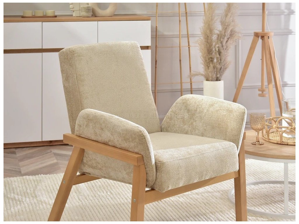 Křeslo potaženo jemnou, sametovou látkou s mírnou strukturou skvěle doplňuje konstrukce a nožky z masivního dřeva.