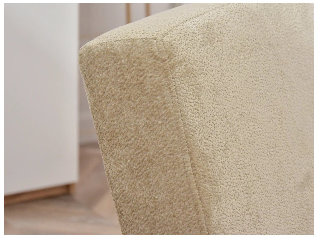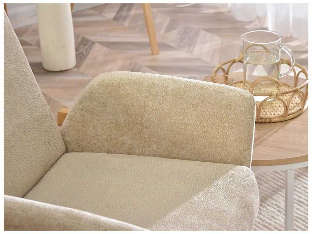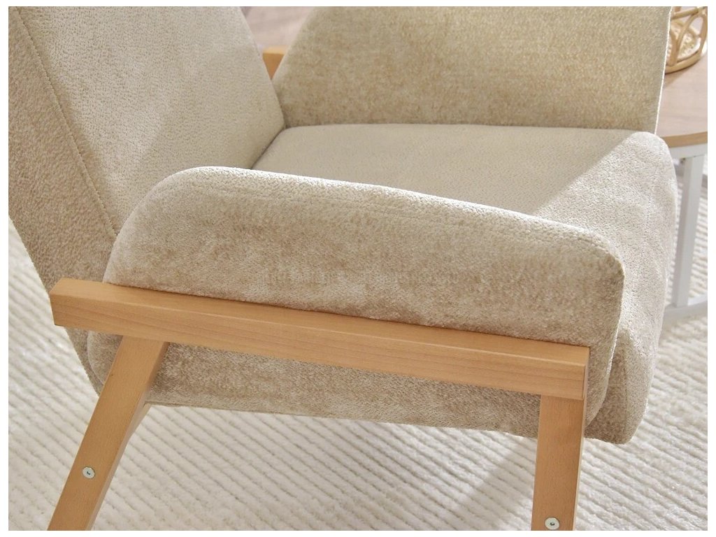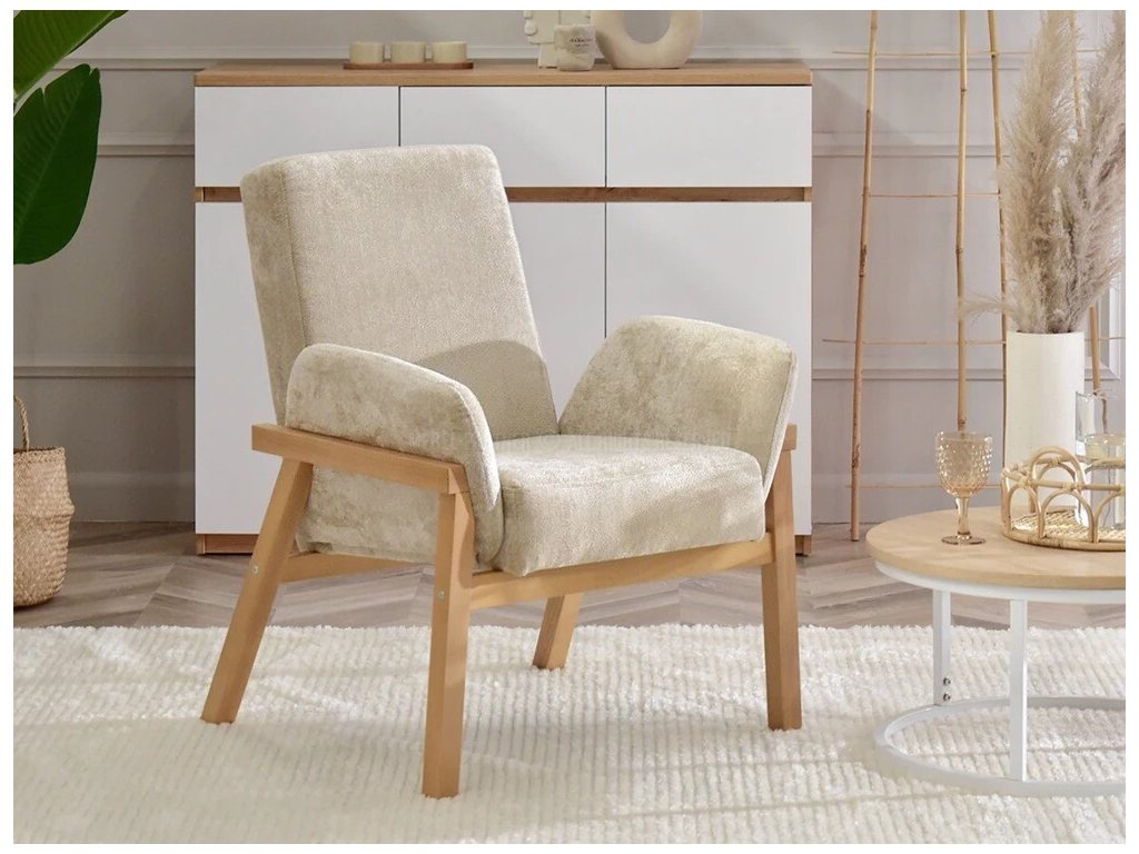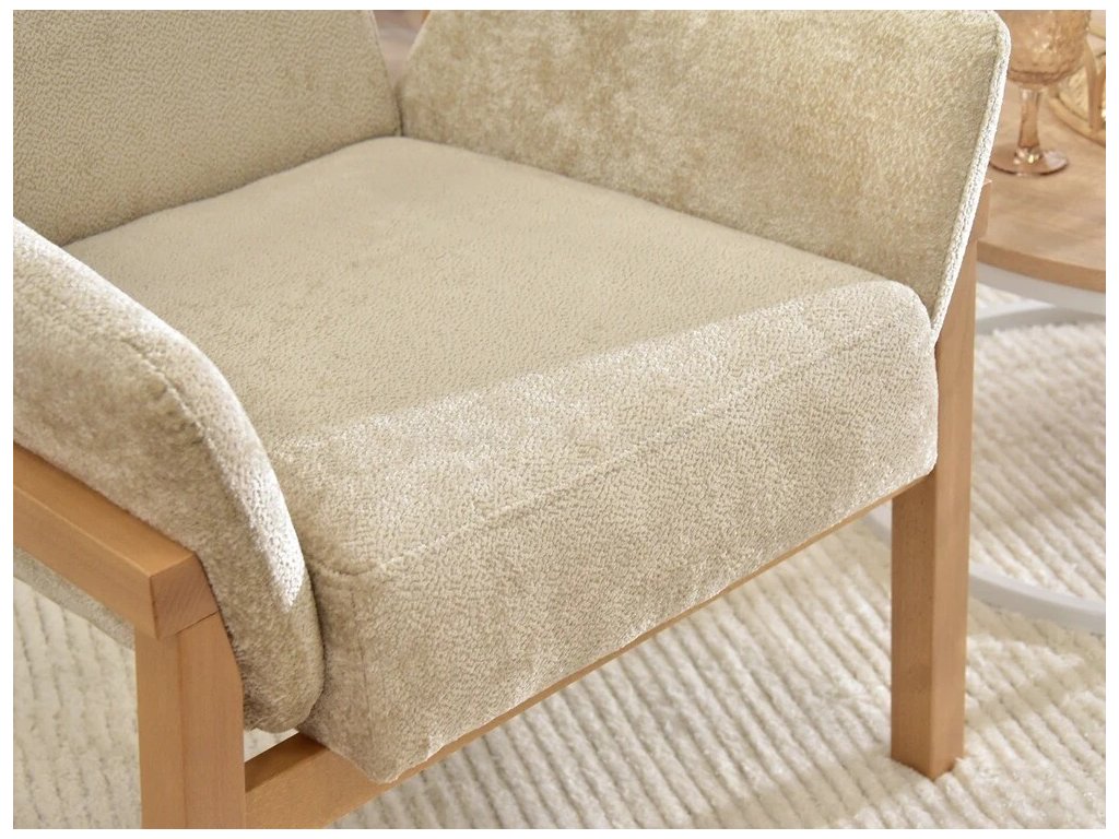 Křeslo potaženo jemnou, sametovou látkou s mírnou strukturou skvěle doplňuje konstrukce a nožky z masivního dřeva.