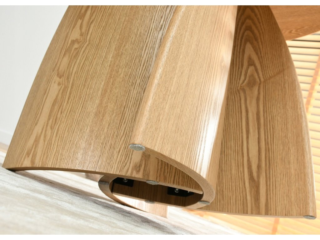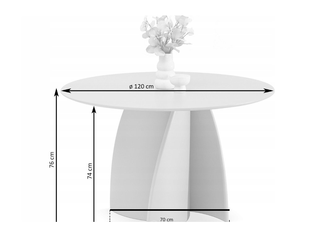 Kulatý jídelní stůl Giana zaujme deskou o průměru 120 cm a dekorativní centrální podnoží, která tvoří charakteristický vizuální prvek. Podnož se skládá ze tří elegantně tvarovaných částí, které směrem dolů vytvářejí dynamickou siluetu a zajišťují celkovou stabilitu. Dýhovaná deska má jemně zkosenou hranu, která působí moderně a zároveň usnadňuje údržbu.