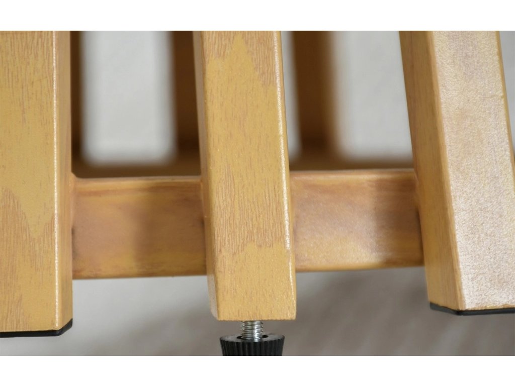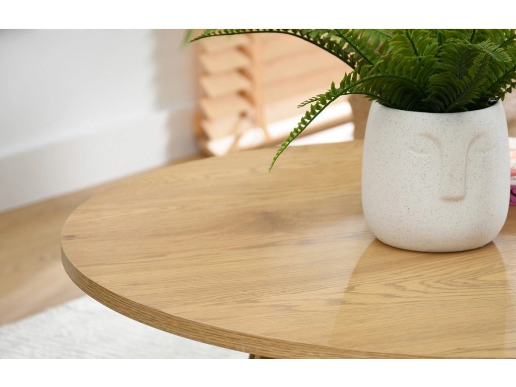 Stolek je vyroben z laminované desky v odstínu dubu, která se snadno udržuje a vyniká vysokou odolností vůči poškození. Kovová konstrukce podnože je pevná a stabilní, díky čemuž stolek působí lehce, ale velmi odolně. Moderní prolamované lamely vytvářejí jedinečný vizuální efekt, který oživí každý interiér.
