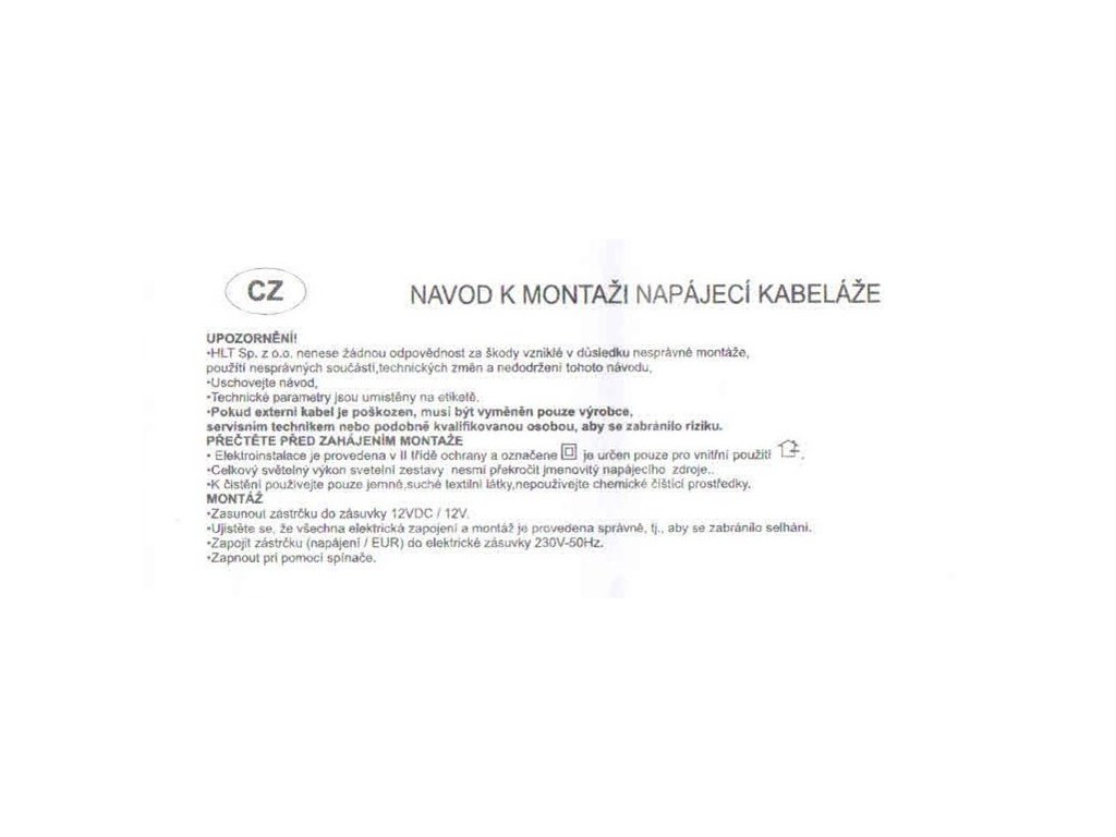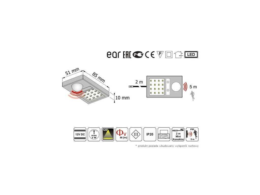 Součástí setu je napájecí zdroj s kabelem délky 2m, 230V-50Hz, výkon max 6W, Led osvětlení se senzorem pohybu s kabelem délky 2m. Výkon 12VDC/MAX 2W. Třída ochrany II, určeno pouze pro vnitřní použití.