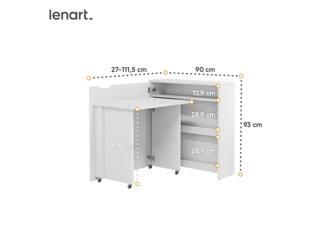 Rozkládací psací stůl Work Concept SLIM je vhodný do menších kanceláří a pokojů. Jednoduché ovládání, moderní design a praktické řešení pro všechny, kteří chtějí ušetřit místo a zároveň nepřijít o elegantně zařízený interiér kanceláře, dětského pokoje či studovny. Po rozložení stůl disponuje policemi, jež slouží k odkládání knih, časopisů nebo kancelářských potřeb.