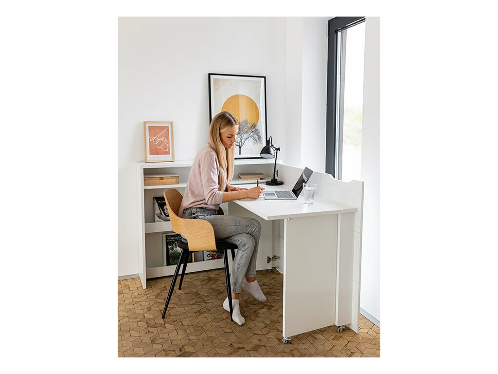 Rozkládací psací stůl Work Concept SLIM je vhodný do menších kanceláří a pokojů. Jednoduché ovládání, moderní design a praktické řešení pro všechny, kteří chtějí ušetřit místo a zároveň nepřijít o elegantně zařízený interiér kanceláře, dětského pokoje či studovny. Po rozložení stůl disponuje policemi, jež slouží k odkládání knih, časopisů nebo kancelářských potřeb.