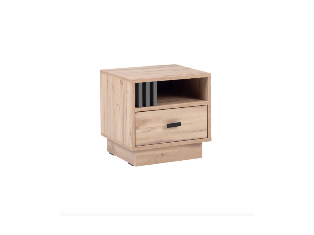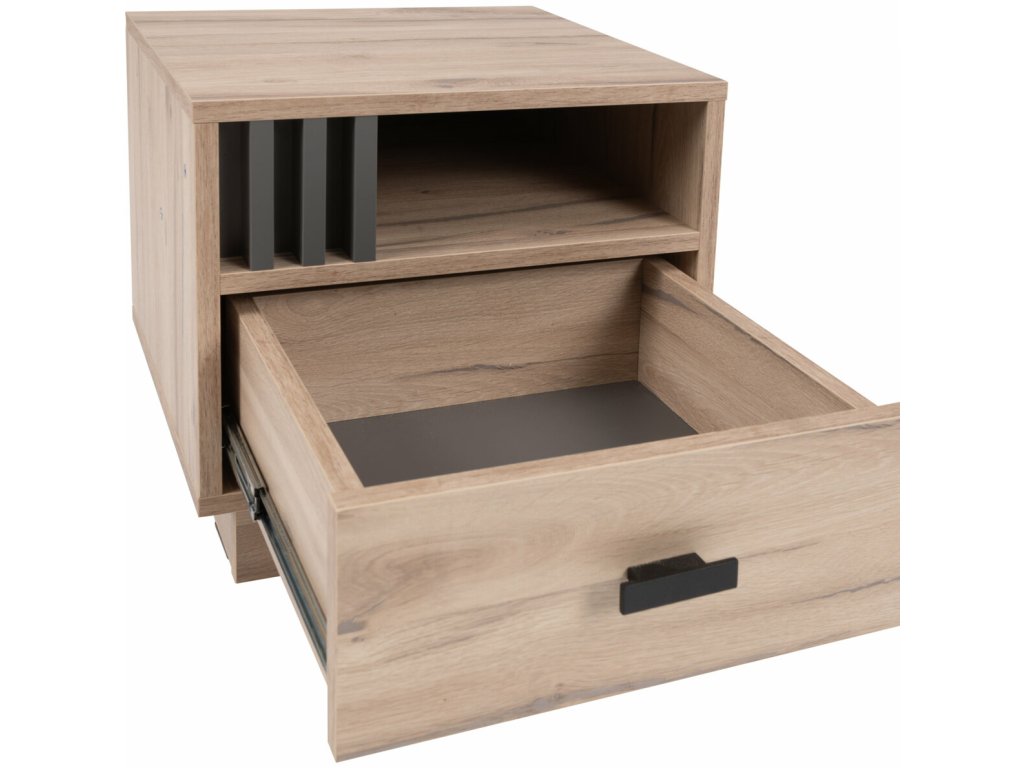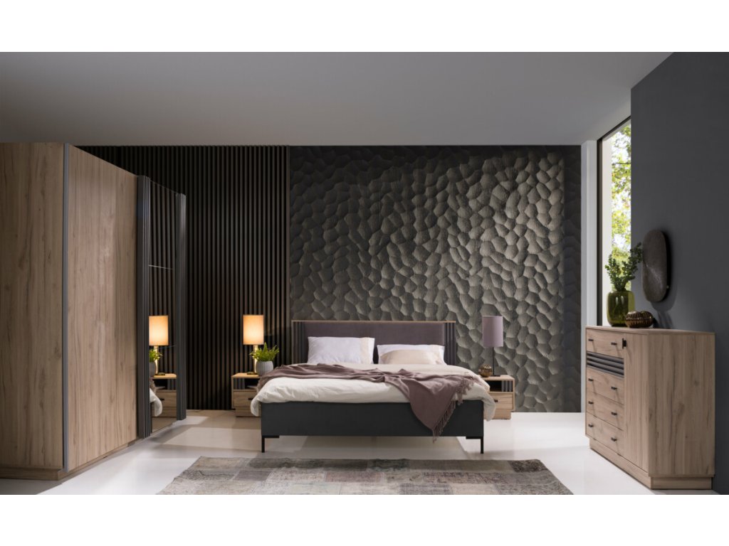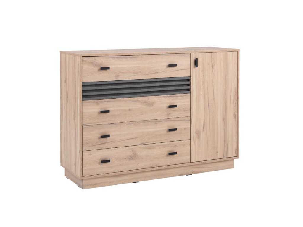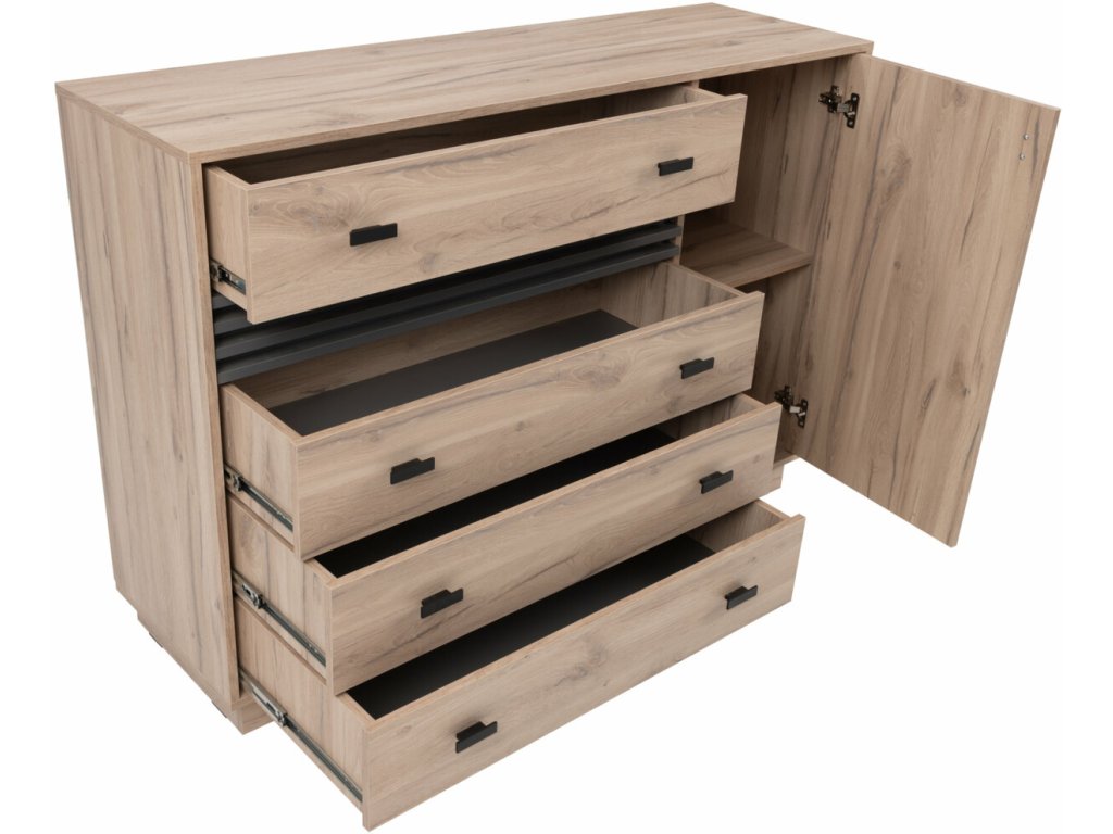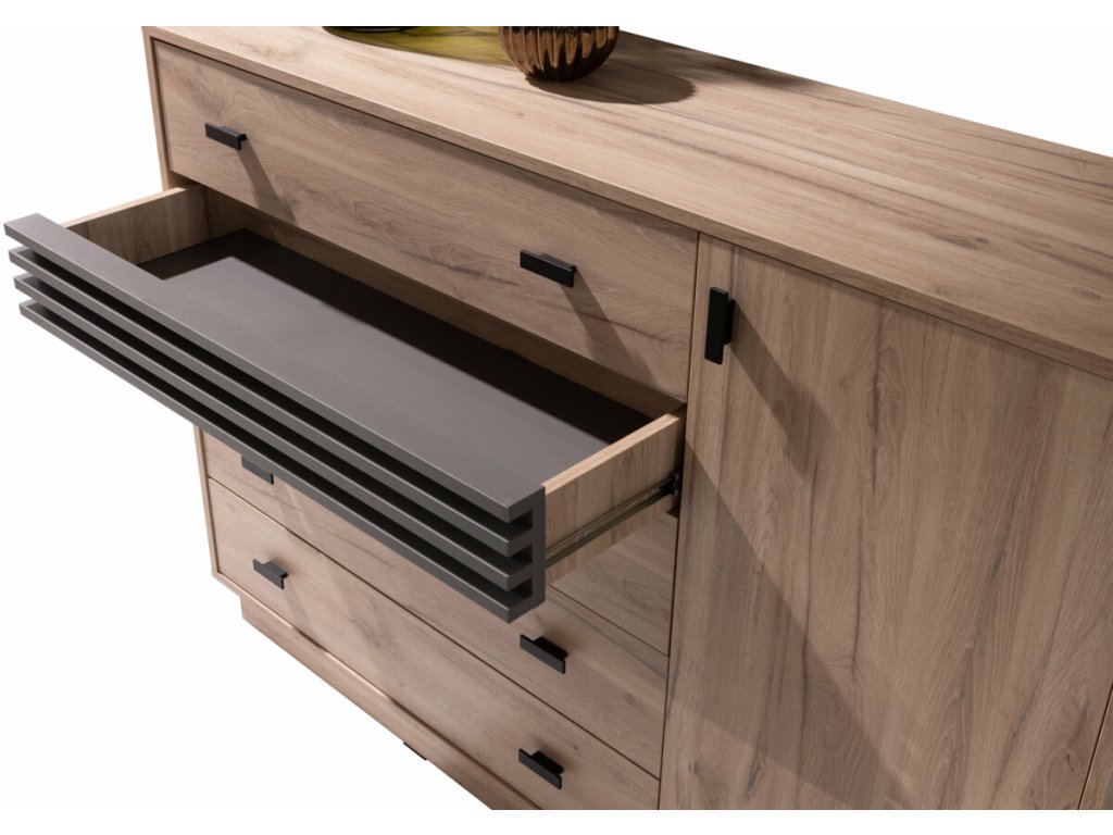 Moderní nábytek Allmo se nese na vlně oblíbeného spojení dekoru dřeva s antracitovou barvou. Tuto kolekci zdobí antracitové žebrování, jež přidává kouskům na originálním vzhledu. Zásuvky a dvířka jsou opatřeny tmavými úchyty, které nenarušují vzhled, naopak jej perfektně doplňují.