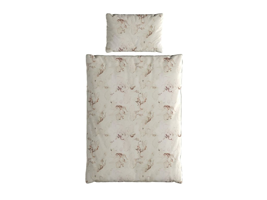 Sada se skládá z peřiny 100 x 135 cm a plochého polštáře 40 x 55 cm, obojí s integrovanou (všitou) výplní, díky čemuž se výplň během používání a praní nepřesouvá ani neshrnuje.
