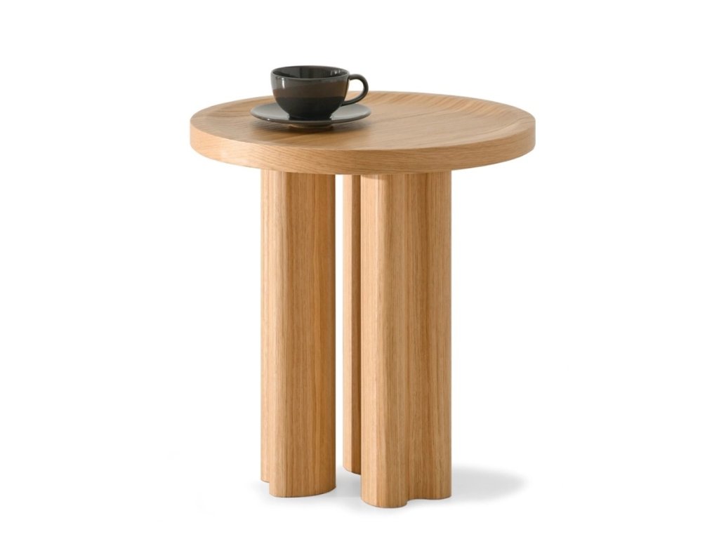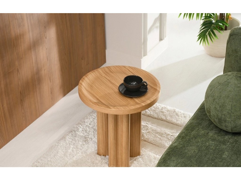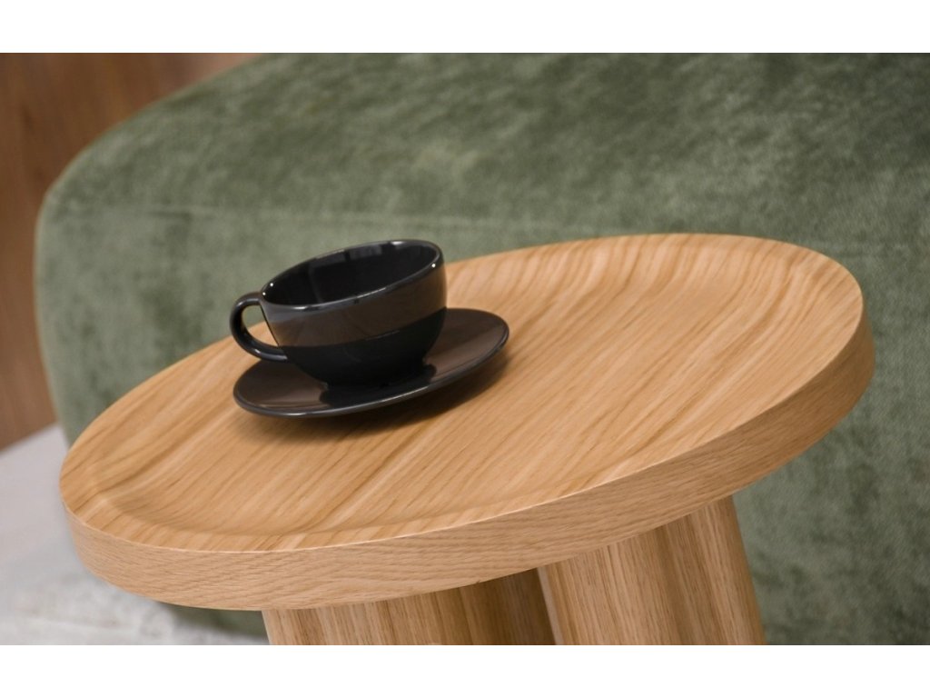 Stolová deska je vyrobena z dýhované MDF desky s přirozenou kresbou dřeva a miskovým tvarem se zvýšeným okrajem, který působí elegantné a zároveň brání sklouznutí drobných předmětů. Tři stabilní válcovité nohy s dýhovaným povrchem ladí s deskou a vytvářejí ucelený a vyvážený celek. Povrchová úprava v odstínu dubu dodává stolku teplý tón a snadno se začlení do světlých i tmavších interiérů.