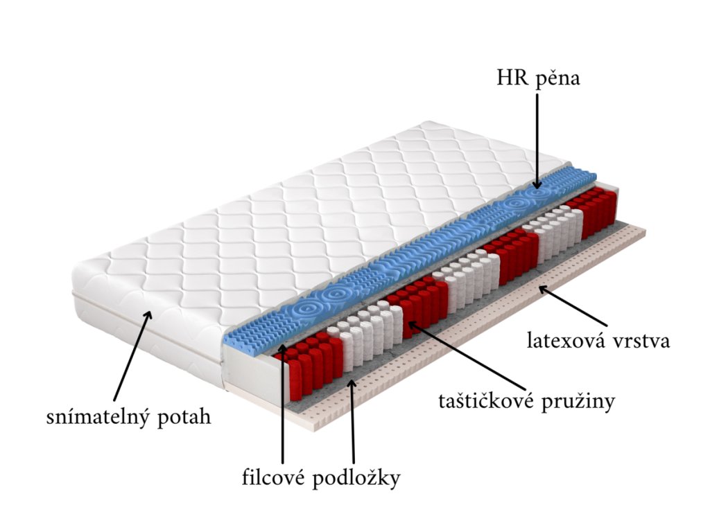 - výplň matrace z HR studené pěny, taštičkových pružin a latexové vrstvy