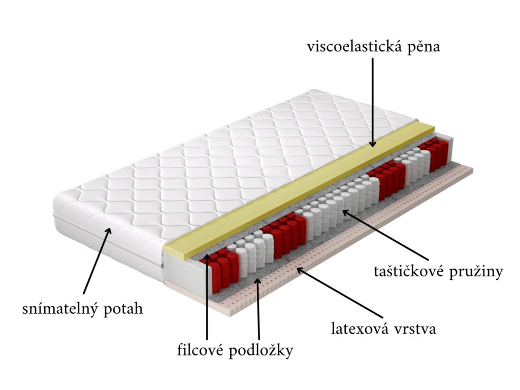 - výplň matrace z viscoelastické pěny, taštičkových pružin a latexové pěny