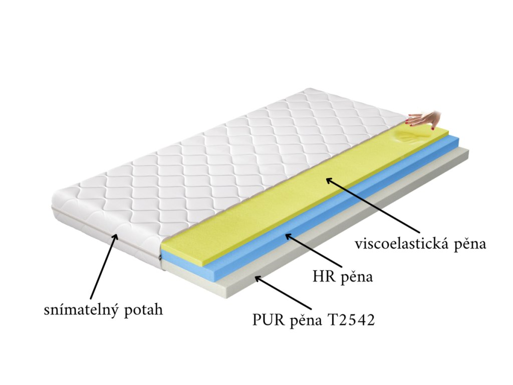 Matrace se skládá z viscoelastické pěny, HR pěny a PUR pěny.