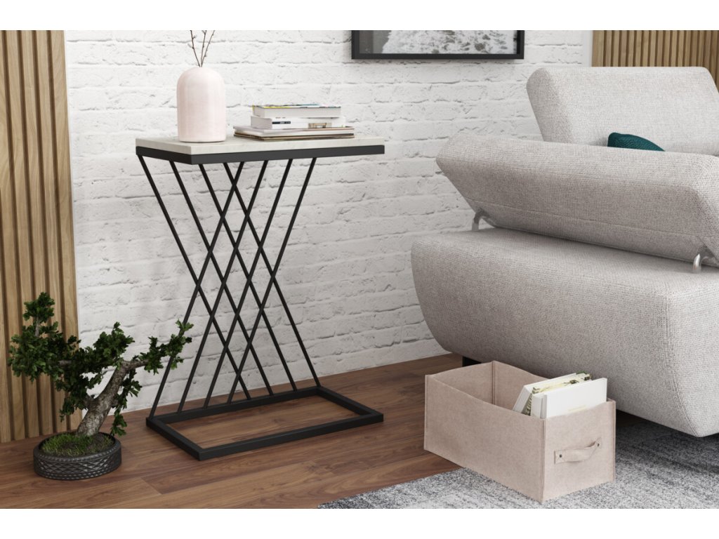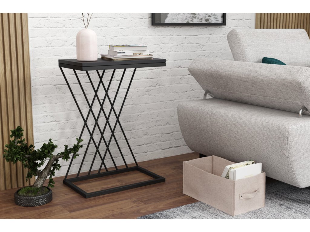 Deska stolku je vyrobená z laminované desky v moderních dekorech, které jsou doplněné o ozdobně překřížené podnoží z kovu. Spojení těchto prvků z něj tvoří nadčasový kousek, skvěle padnoucí do moderních interiérů.